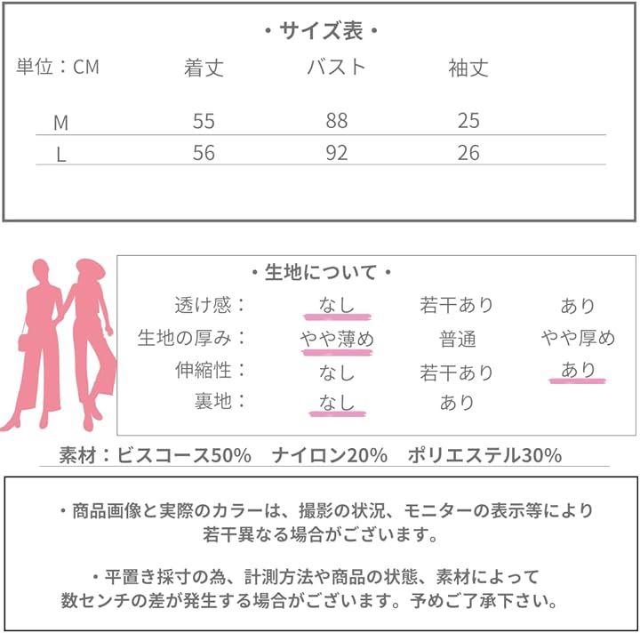 「サイズ」 Mサイズ 着丈55cm バスト88cm 袖丈25cm Lサイズ 着丈56cm バスト92cm 袖丈26cm 「素材」ビスコース50%ナイロン20%ポリエステル30% *商品画像と実際のカラーは、撮影の状況、モニターの表示等により若干異なる場合がございます。