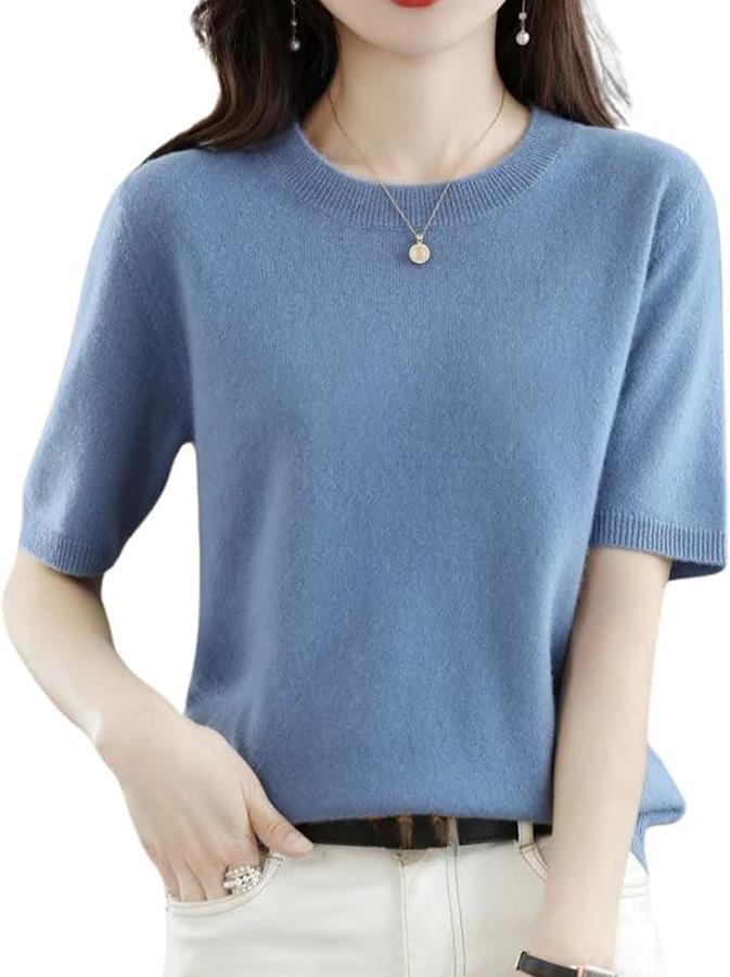 クルーネックの半袖に、襟と袖がリブ仕様になって、フェミニンな大人の女性を演出。