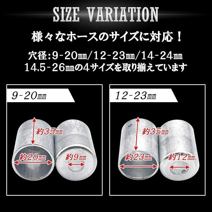 穴径9mm、12mm、14mm、14.5mmの4サイズを取り揃えてますので、様々なホースのサイズに対応いたします。