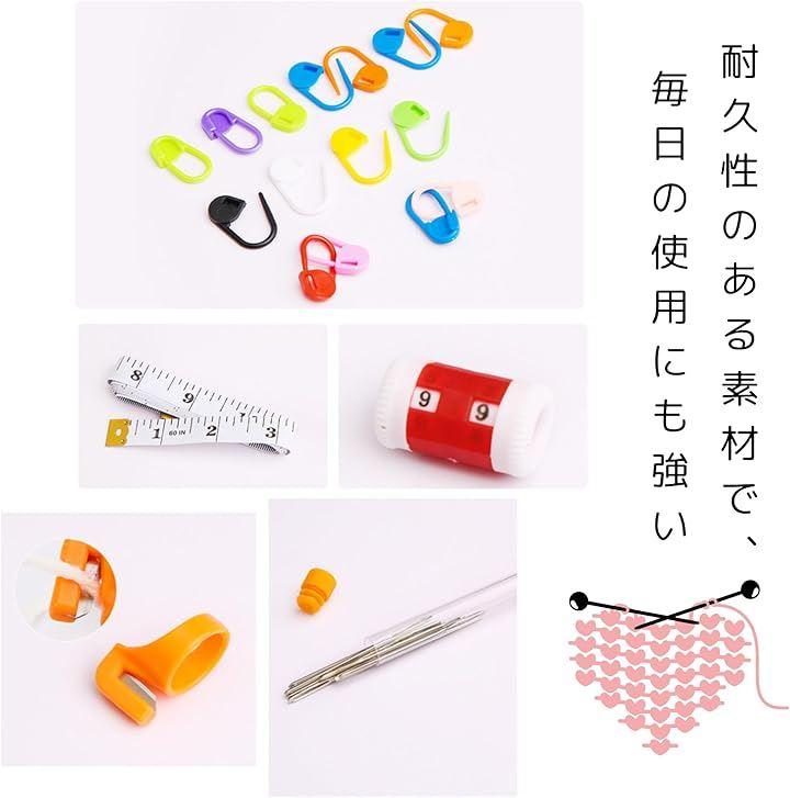 「多機能ツールで効率アップ」段数マーカーや巻尺、リングナイフなどの小物がセットに含まれており、編み物の効率を大幅に向上させます。