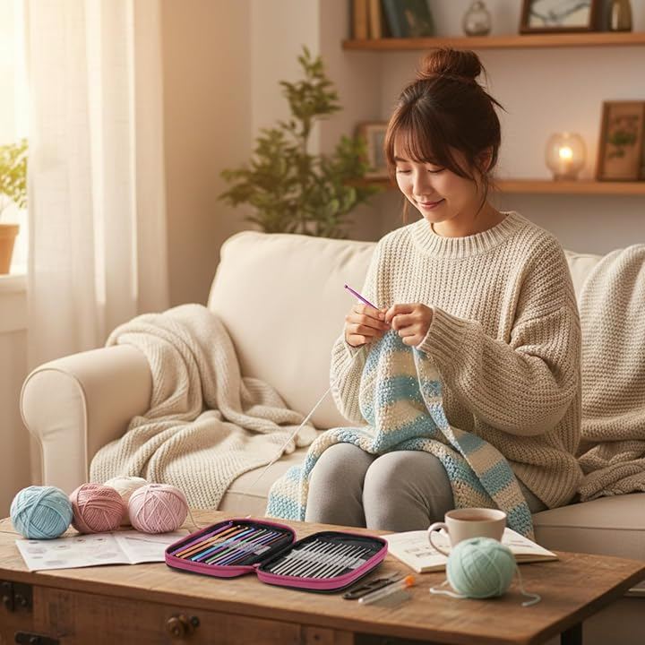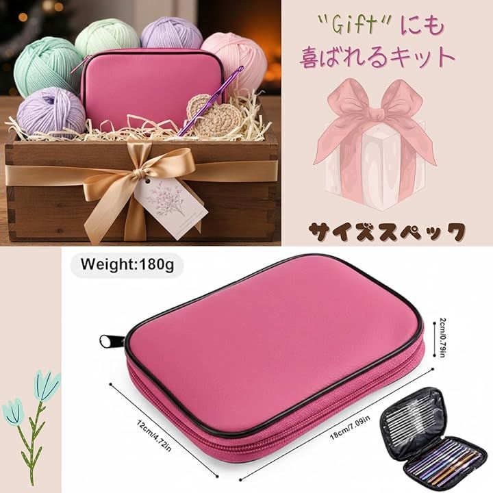 「デザイン」 ピンクの収納ケースとカラフルな針が、編み物時間をより楽しく演出。