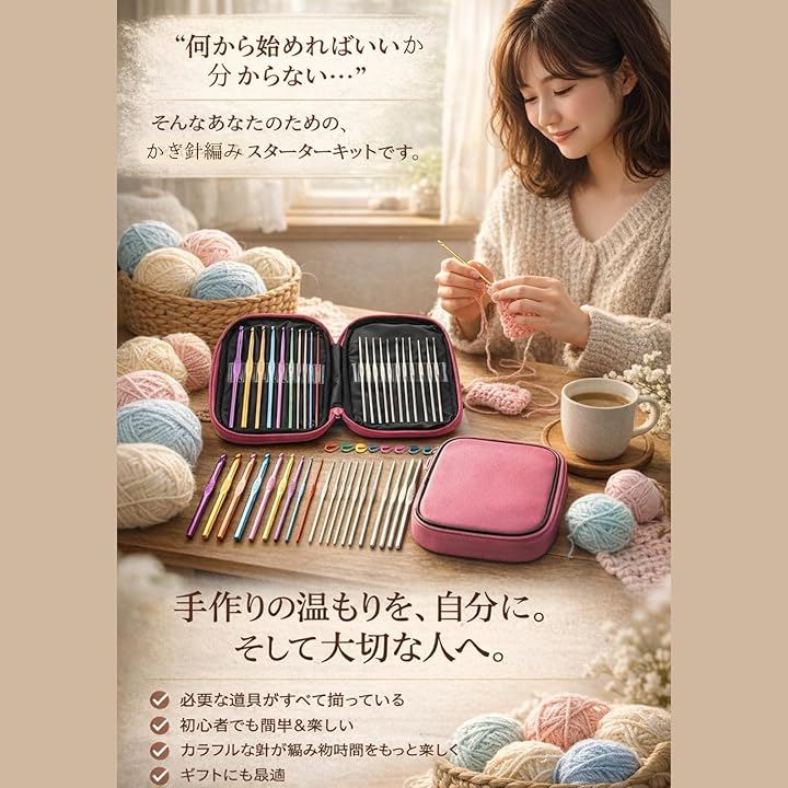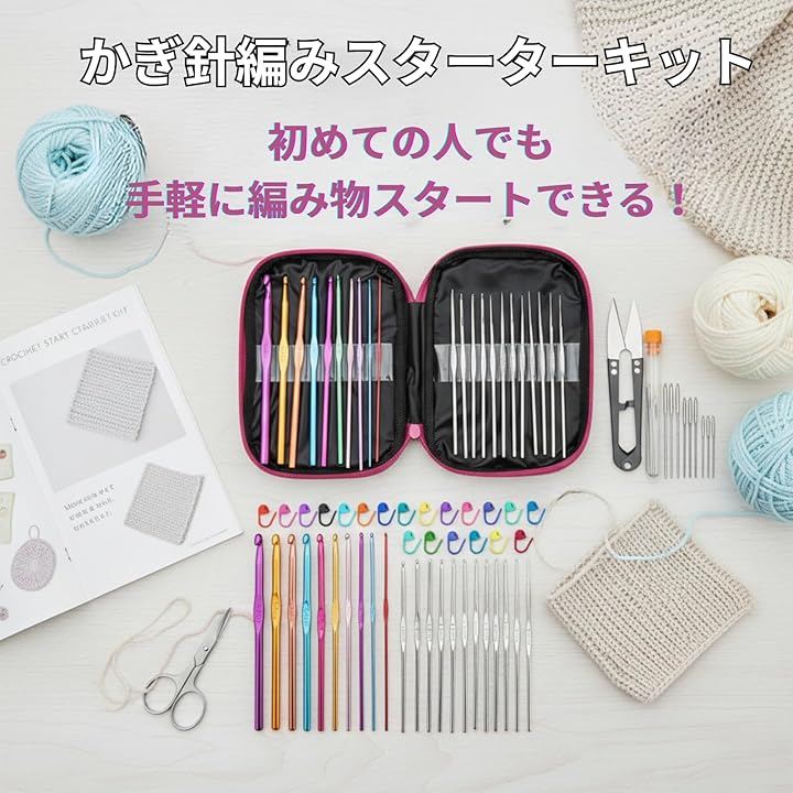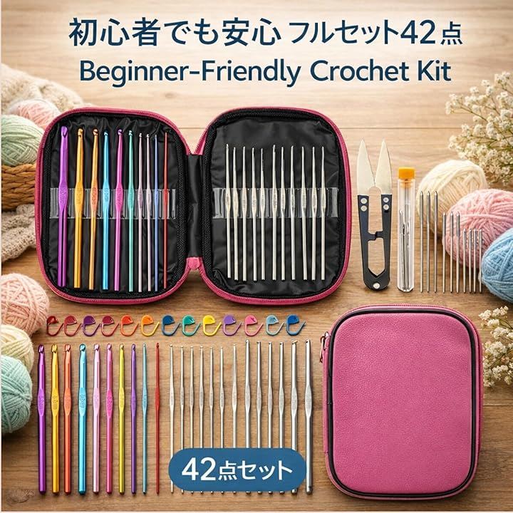 「機能」 初心者に必要なかぎ針・スチール針・補助道具をまとめた42点フルセット。