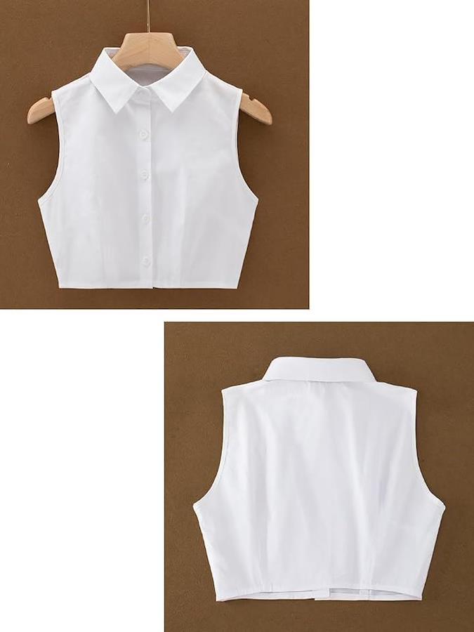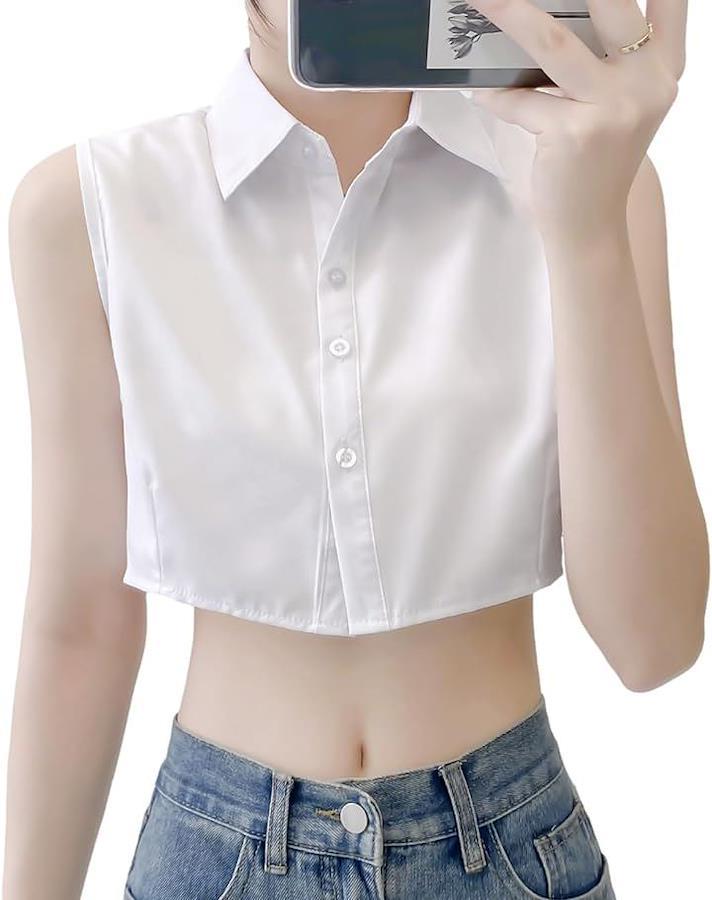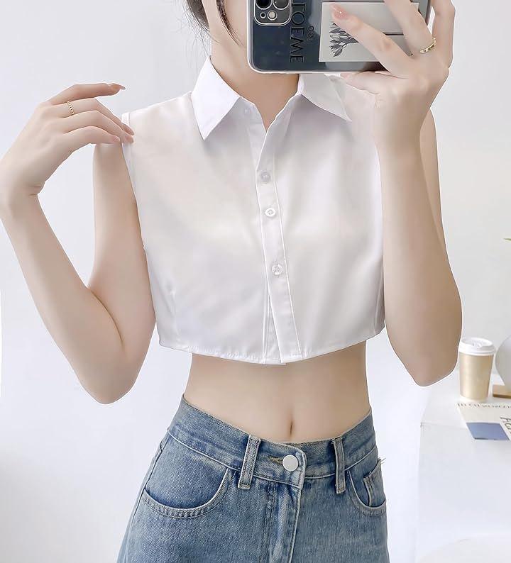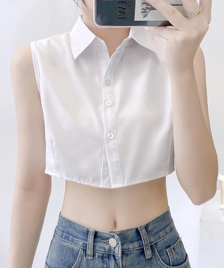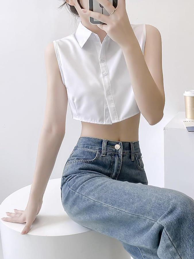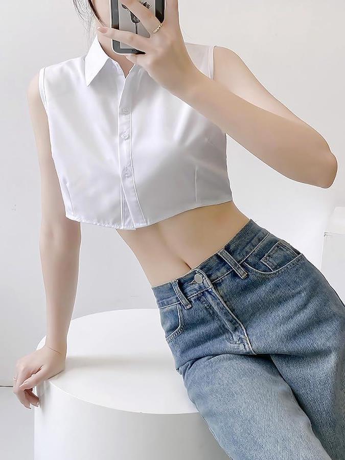 Cropped, sleeveless shirt blouse, short, regular collar, open shoulder, off-shoulder, midriff-baring, plain color.
