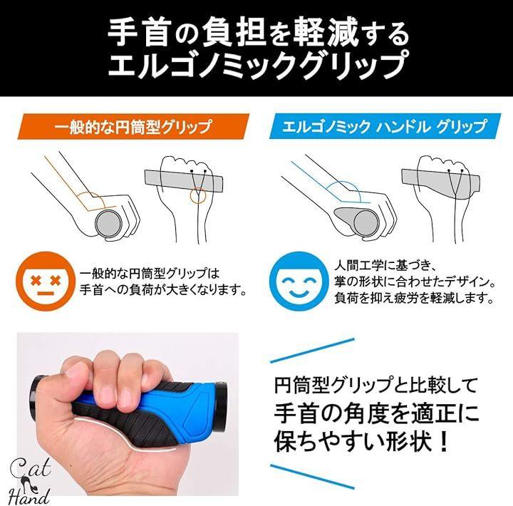 v「 掌・手首の負荷を軽くする 」羽根状の膨らみを設けたデザインにより、一般的な円筒型グリップと比較して、掌にかかる荷重を分散し、手首の角度を適正に保ちやすい形状になっています。