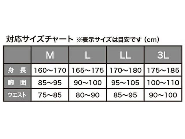 ■本体素材:表 ポリエステル(PUコーティング)、裏 中綿+ポリエステル■耐水圧:10000mm■透湿度:5000g/m2/24h■サイズ目安(cm):Mサイズ-身長 160~170、胸囲85~95、ウエスト 75~85Lサイズ-身長 165~175、胸囲90~100、ウエスト 80~90LLサイズ-身長 170~180、胸囲95~105、ウエスト 85~953Lサイズ-身長 175~185、胸囲100~110、ウエスト 90~100
