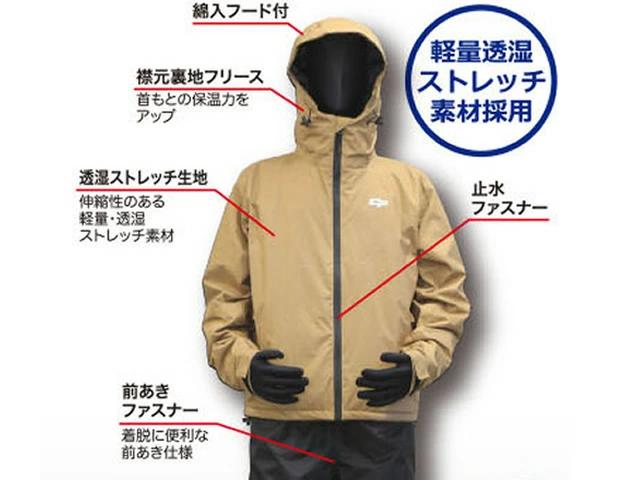 ─特徴─・軽量透湿ストレッチ生地(PUラミネート)・コートタイプ・一体型フード・ノーマルパンツ(前ファスナー付)