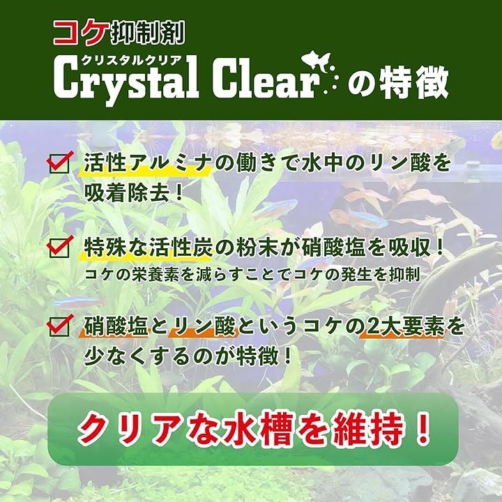 活性アルミナの働きで水中のリン酸を吸着除去し、コケのないクリアな水槽を維持します。