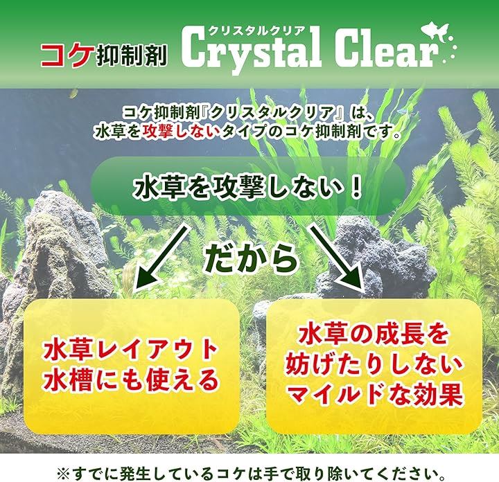水草レイアウト水槽にも使える、水草を攻撃しないタイプのコケ抑制剤です。