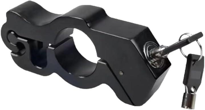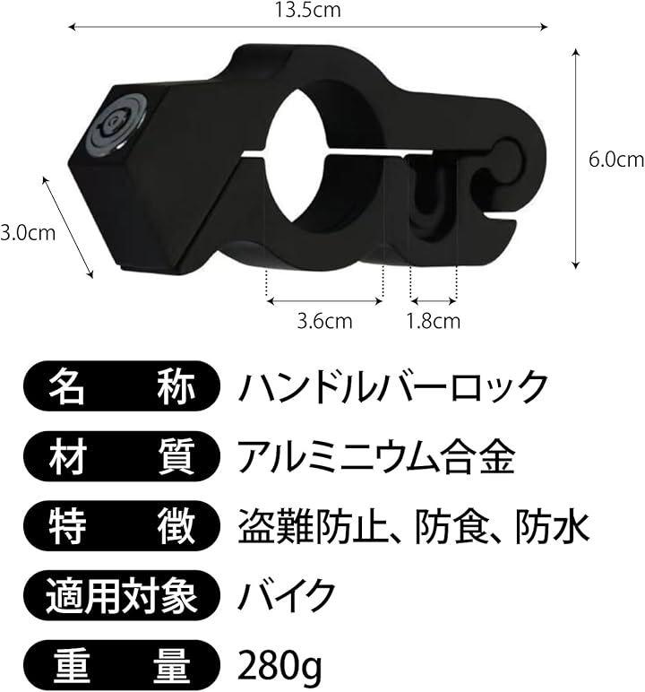 サイズ: 13.5cmx6.0cmx1.8cm グリップ径: 27~38mmに適合 レバー径: 18~20mmに適合 材質: アルミ合金 パッケージ内容: 本体x1個、専用鍵x2個、傷防止ラバーx1パック