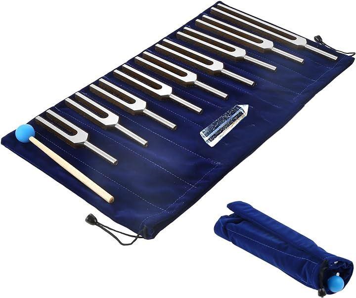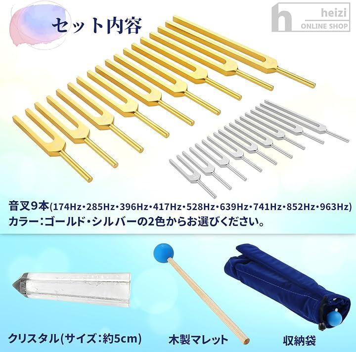 「セット内容」音叉9本(174 Hz, 285 Hz, 396 Hz, 417 Hz, 528 Hz, 639 Hz, 741 Hz, 852 Hz, 963 Hz)、クリスタル(サイズ:約5cm)、木製マレット、収納袋