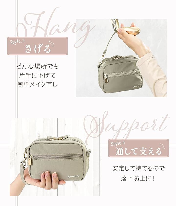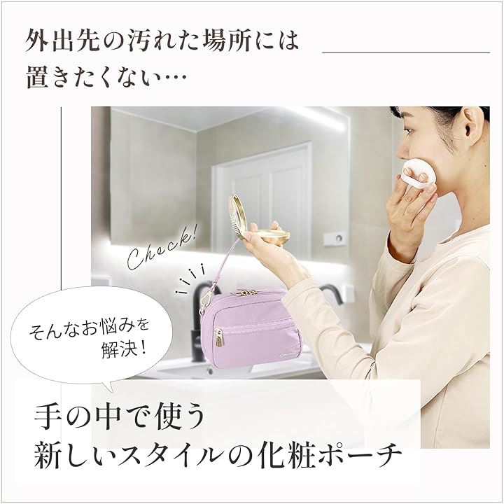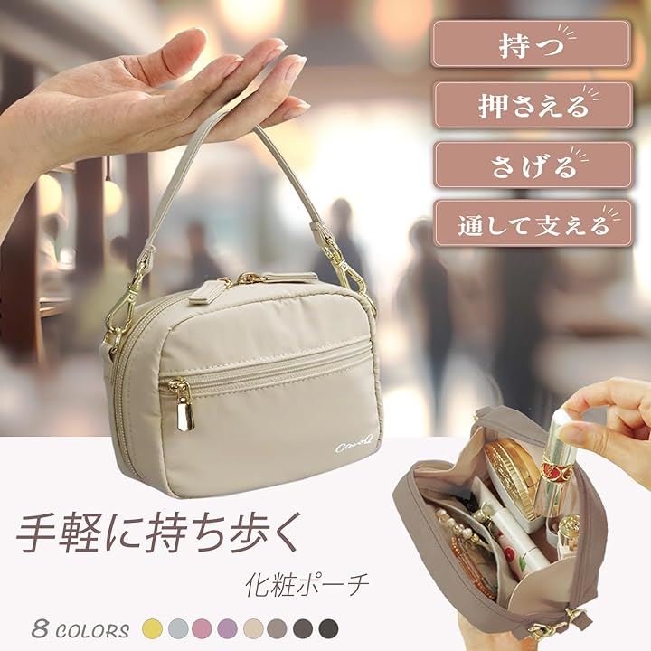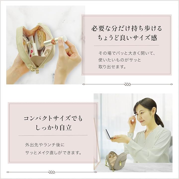「収納力と機能性」自立する形状で、化粧品や小物を整理しやすいよう中には仕切りやポケットがあり、ハンドストラップが付いておりますので、持ち運びにも便利です。