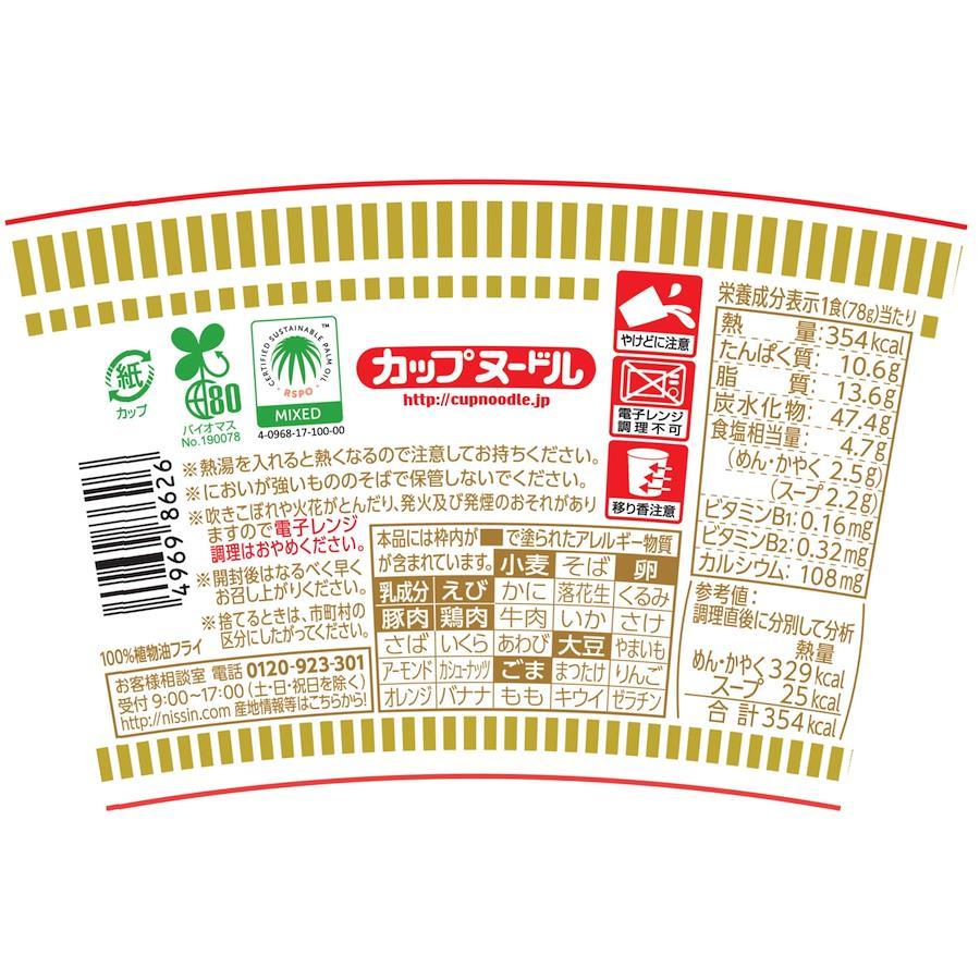 油揚げめん(小麦粉(国内製造)、植物油脂、食塩、チキンエキス、ポークエキス、しょうゆ、ポーク調味料、たん白加水分解物、香辛料)、かやく(味付豚ミンチ、味付卵、味付えび、味付豚肉、ねぎ)、スープ(糖類、粉末しょうゆ、食塩、香辛料、たん白加水分解物、香味調味料、ポーク調味料、メンマパウダー)/加工でん粉、調味料(アミノ酸等)、炭酸Ca、カラメル色素、かんすい、増粘多糖類、カロチノイド色素、乳化剤、酸化防止剤(ビタミンE)、香辛料抽出物、くん液、香料、ビタミンB2、ビタミンB1、酸味料、(一部にえび・小麦・卵・乳成分・ごま・大豆・鶏肉・豚肉を含む)