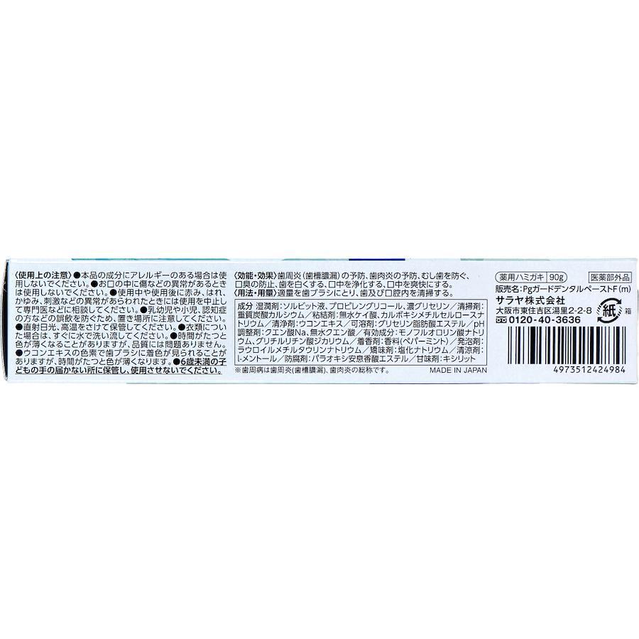 【使用上の注意】・本品の成分にアレルギーのある場合は使用しないでください。・お口の中に傷などの異常があるときは使用しないでください。・使用中や使用後に赤み、はれ、かゆみ、刺激などの異常があらわれたときには使用を中止して専門医などに相談してください。・乳幼児や小児、認知症の方などの誤飲を防ぐため、置き場所に注意してください。・直射日光、高温をさけて保管してください。・衣類についた場合は、すぐに水で洗い流してください。・時間がたつと色が薄くなることがありますが、品質には問題ありません。・ウコンエキスの色素で歯ブラシに着色が見られることがありますが、時間がたつと色が薄くなります。・6歳未満の子どもの手の届かない所に保管し、使用させないでください。