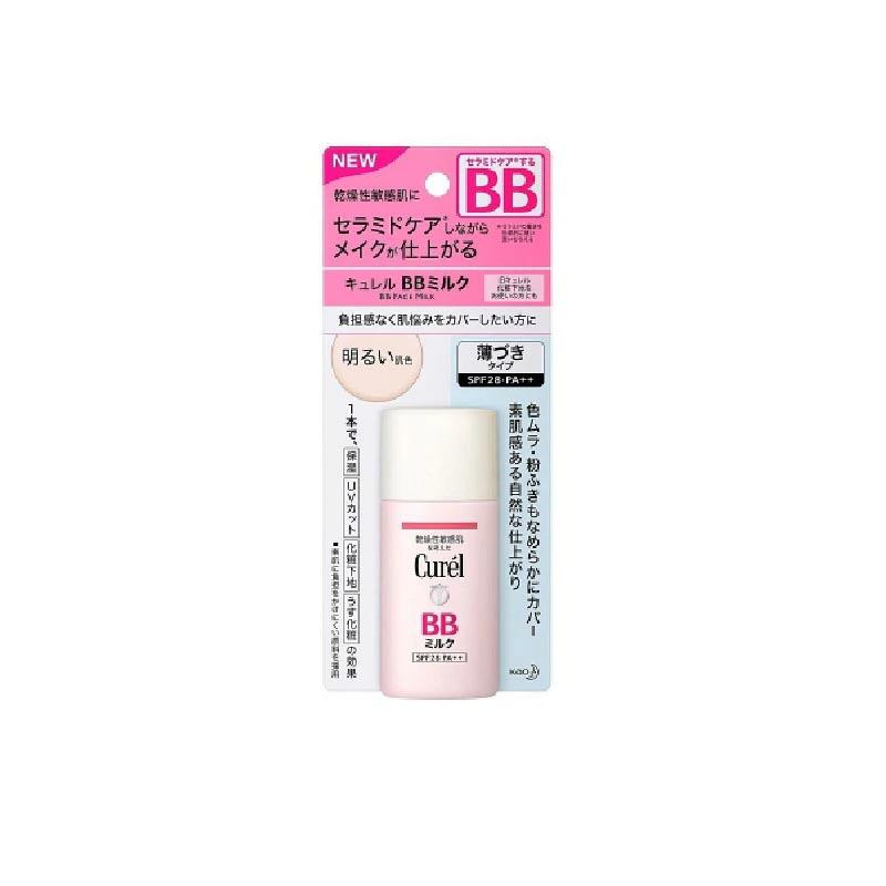 【キュレル BBミルク 明るい肌色の商品詳細】●乾燥性敏感肌を考えたキュレルから、セラミドケアしながらメイクが仕上がるBBミルクが誕生!●色ムラ・粉ふきもなめらかにカバー。素肌感ある自然な仕上がり!負担感なく肌悩みをカバーします。●1本で「保湿」「UVカット」「化粧下地」「うす化粧」の効果!●素肌に負担をかけにくい原料を採用しました。●紫外線吸収剤無配合●アルコールフリー(エチルアルコール無添加)●アレルギーテスト済み※●敏感肌の方の協力によるパッチテスト済み※●にきびのもとになりにくい処方。ノンコメドジェニックテスト済み※●無香料●薄づきタイプ●SPF28 PA++※すべての方にアレルギーや皮膚刺激が起こらない、コメド(にきびのもと)ができないというわけではありません。【使用方法】・基礎化粧品でお肌を整えた後、よく振ってから適量(直径約1cm*2回)をとり、顔全体にムラなくきれいにのばします。・特にカバーしたい部分には、少量ずつ重ねづけしてください。・お好みに合わせて、本品の後にファンデーションやおしろいをお使いください。【成分】水、シクロペンタシロキサン、ジメチコン、グリセリン、セチルPGヒドロキシエチルパルミタミド、水添ポリイソブテン、PEG-12ジメチコン、ポリシリコーン-9、アスナロ枝エキス、ユーカリ葉エキス、BG、硫酸Mg、グリセリルウンデシルジメチコン、パルミチン酸デキストリン、フェノキシエタノール、メチルパラベン、酸化チタン、酸化亜鉛、ポリメチルシルセスキオキサン、酸化鉄、アルミナ、シリカ、マイカ、メチコン、水酸化AL【注意事項】・湿疹、皮フ炎(かぶれ、ただれ)、にきびなどの皮フ障害のある時は、悪化させる恐れがあるので使わないでください。・赤み、かゆみ、刺激等の異常が出たら使用を中止し、皮フ科医へ相談してください。使い続けると症状が悪化することがあります。・目に入らないよう注意し、入った時は、すぐに充分洗い流してください。異常が残る場合は眼科医に相談してください。・子供や認知症の方などの誤飲等を防ぐため、置き場所にご注意ください。【原産国】日本