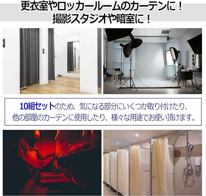 リビングや寝室などのプライベート空間に。一人暮らしの防犯対策に。更衣室やロッカールームのカーテンに。撮影スタジオや暗室に。10組セットのため、気になる部分にいくつか取り付けたり、ほかの部屋のカーテンに使用したり、さまざまな用途でお使いいただけます。
