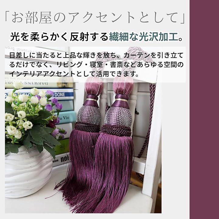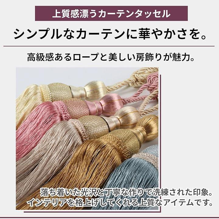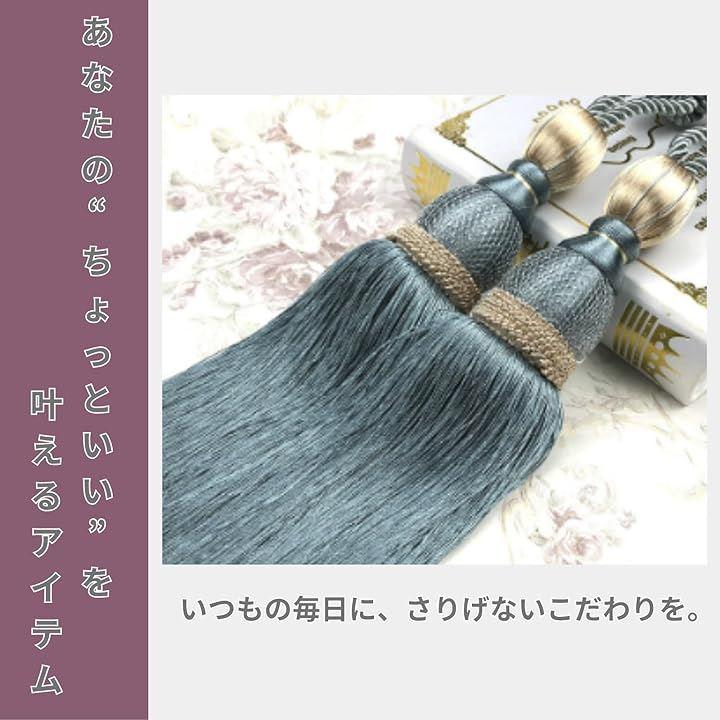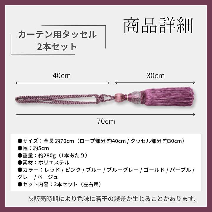 「商品詳細」 *サイズ:全長 約70cm(ロープ部分 約40cm / タッセル部分 約30cm) 幅:約5cm *重量:約280g(1本あたり) *素材:ポリエステル *カラー:レッド / ピンク / ブルー / ブルーグレー / ゴールド / パープル / グレー / ベージュ *セット内容:2本セット(左右用)