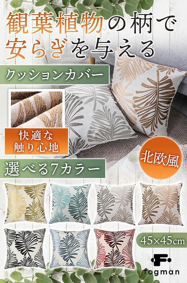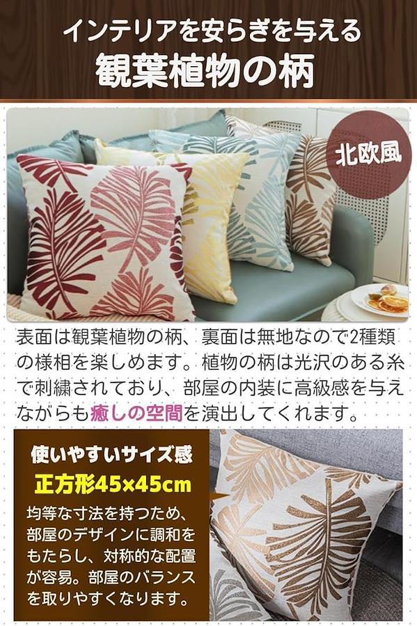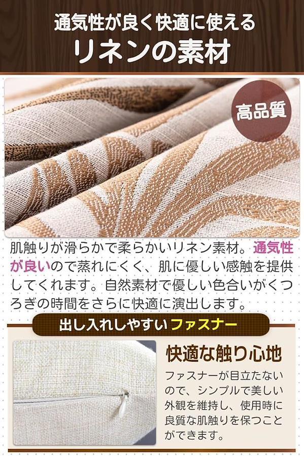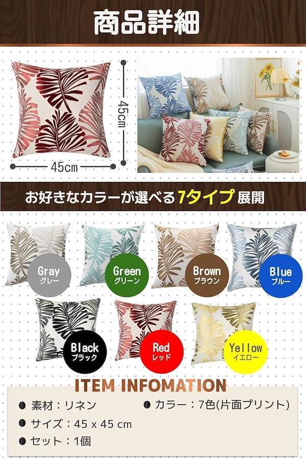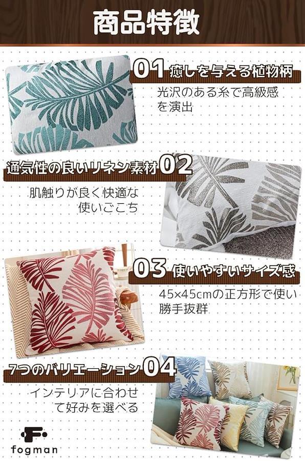 「商品特徴」(1)癒しを与える植物柄:光沢のある糸で高級感を演出/(2)通気性の良いリネン素材:肌触りが良く快適な使いごこち/(3)使いやすいサイズ感:45x45cmの正方形で使い勝手抜群/(4)7つのバリエーション:インテリアに合わせて好みを選べる