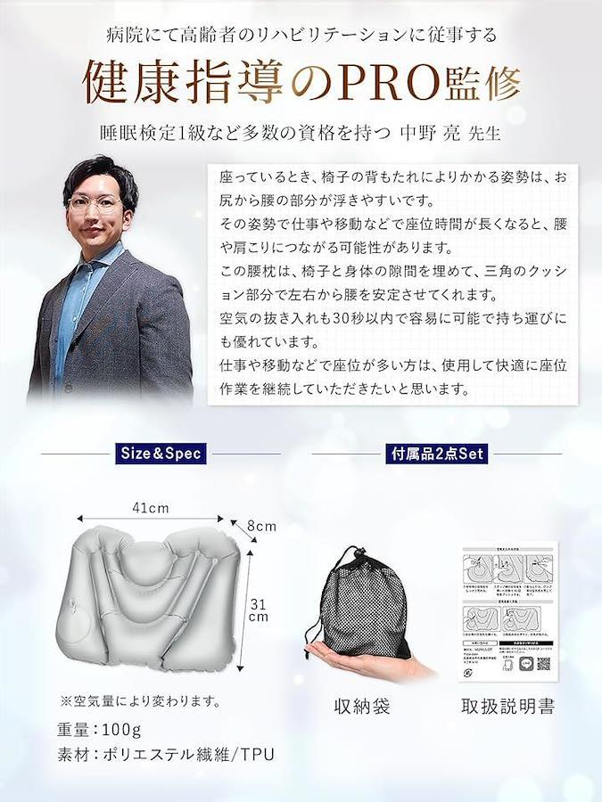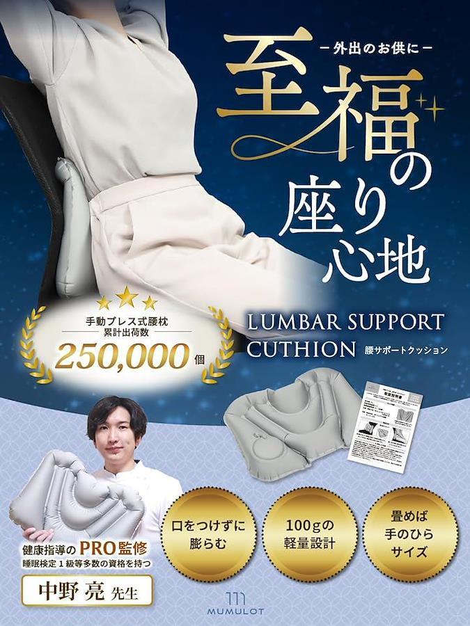 「健康指導のPRO監修」MUMULOTのクッションは、現役の健康指導のPROが監修した特別仕様なので腰にしっかりとフィットする腰まくらです。