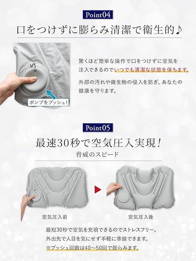 「口をつけない清潔仕様」移動中にクッションにエアーを入れるのは周囲の目が気になるし、ちょっと面倒くさい…と思ったそこのあなた。ご安心ください。