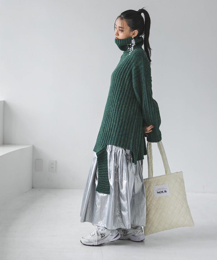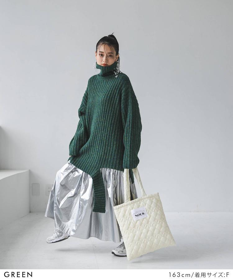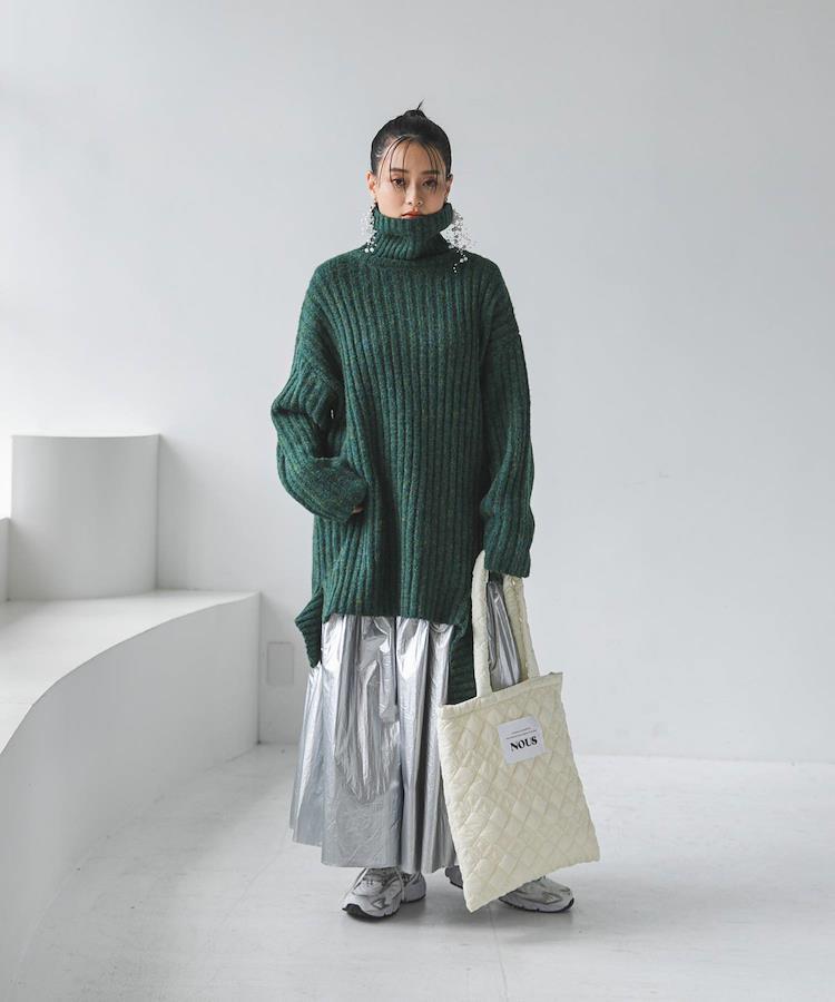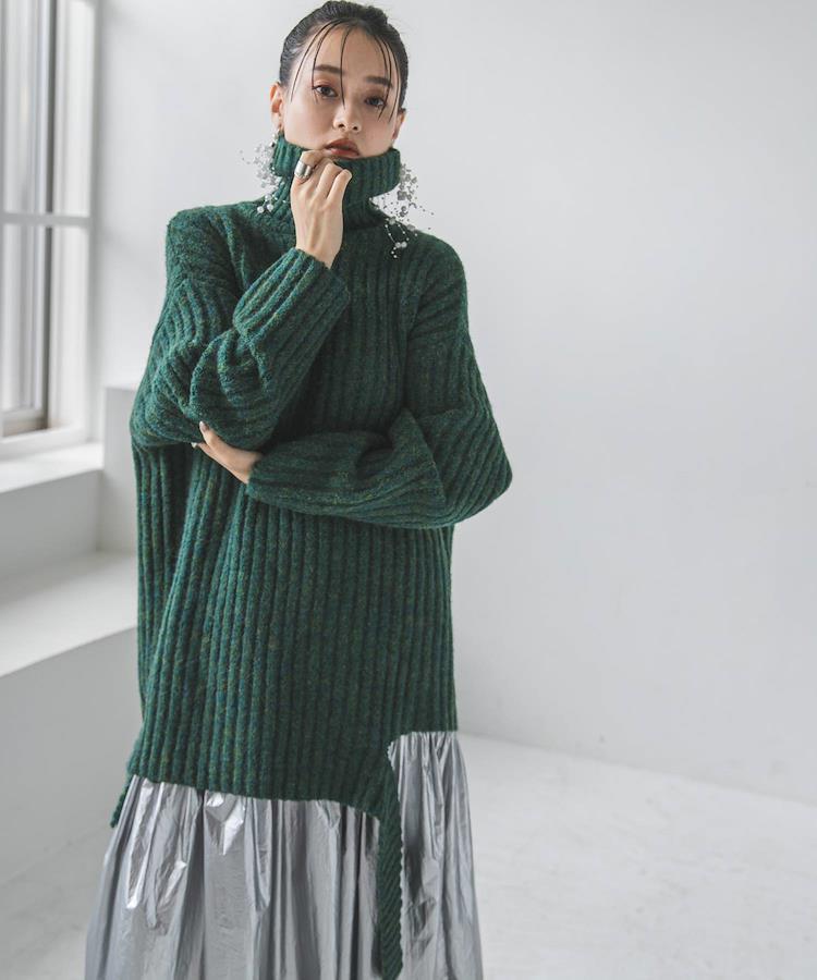 緩めのタートルネックに肩落ちのドロップショルダーが抜け感のある女性らしさを演出○