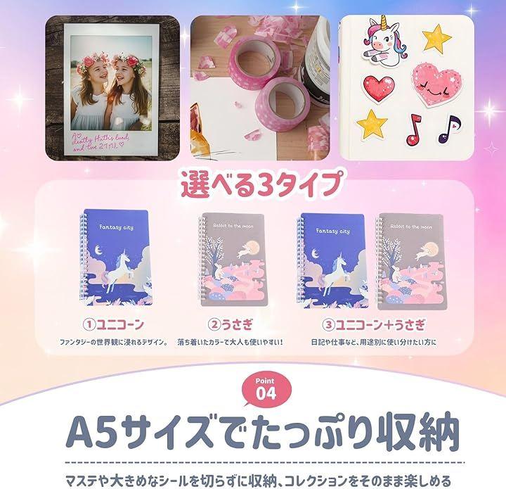 ユニコーン柄1冊、うさぎ柄1冊、ユニコーン柄とうさぎ柄のセットの3種類の可愛い表紙からから選べます。