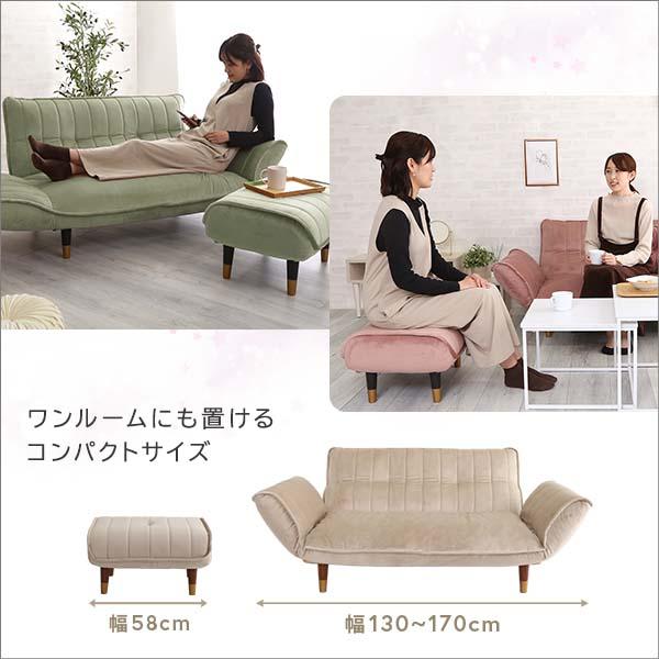 【素材】主材/張地:ポリエステル 100%構造部材:スチールパイプ、ポケットコイルスプリング中身:ウレタン【商品サイズ】2人掛け:W130-170×D78-113×H31.5-64cmオットマン:W58×D48×H31cm【商品重量】2人掛け:15kgオットマン:4s【梱包サイズ】2人掛け:W125×D50×H63cmオットマン:W72×D42×H16cm【梱包重量】2人掛け:16kgオットマン:5s【生産国】日本【カラー】ピンク&ブラック(PKBK)、ピンク&ブラウン(PKBR)、グリーン&ブラック(GEBK)、グリーン&ブラウン(GEBR)、グレー&ブラック(GYBK)、グレー&ブラウン(GYBR)、ベージュ&ブラック(BEBK)、ベージュ&ブラウン(BEBR)、ホワイト&ブラック(WHBK)、ホワイト&ブラウン(WHBR)【その他】完成品>> ベロアカウチソファ【1人掛け-単品-】はこちら >> ベロアカウチソファ【2人掛け-単品-】はこちら >> ベロアカウチソファ【オットマン】はこちら >> ベロアカウチソファ【1人掛け+オットマン】はこちら