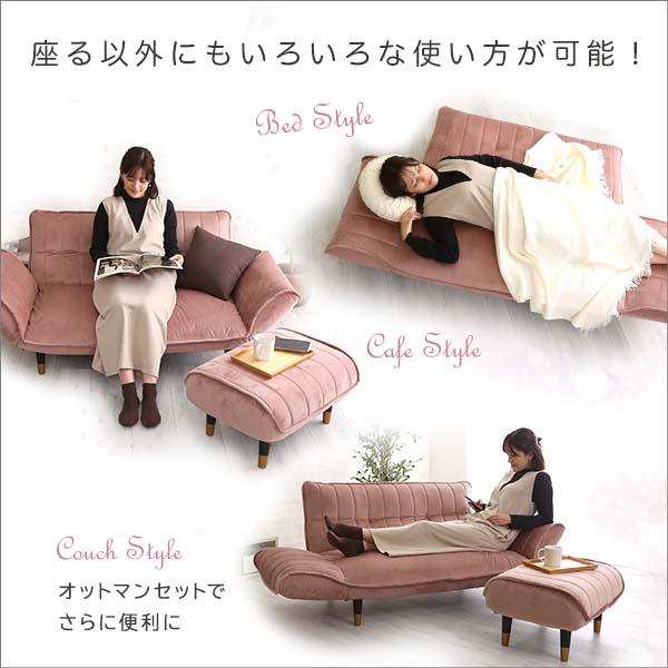 【素材】主材/張地:ポリエステル 100%構造部材:スチールパイプ、ポケットコイルスプリング中身:ウレタン【商品サイズ】2人掛け:W130-170×D78-113×H31.5-64cmオットマン:W58×D48×H31cm【商品重量】2人掛け:15kgオットマン:4s【梱包サイズ】2人掛け:W125×D50×H63cmオットマン:W72×D42×H16cm【梱包重量】2人掛け:16kgオットマン:5s【生産国】日本【カラー】ピンク&ブラック(PKBK)、ピンク&ブラウン(PKBR)、グリーン&ブラック(GEBK)、グリーン&ブラウン(GEBR)、グレー&ブラック(GYBK)、グレー&ブラウン(GYBR)、ベージュ&ブラック(BEBK)、ベージュ&ブラウン(BEBR)、ホワイト&ブラック(WHBK)、ホワイト&ブラウン(WHBR)【その他】完成品>> ベロアカウチソファ【1人掛け-単品-】はこちら >> ベロアカウチソファ【2人掛け-単品-】はこちら >> ベロアカウチソファ【オットマン】はこちら >> ベロアカウチソファ【1人掛け+オットマン】はこちら
