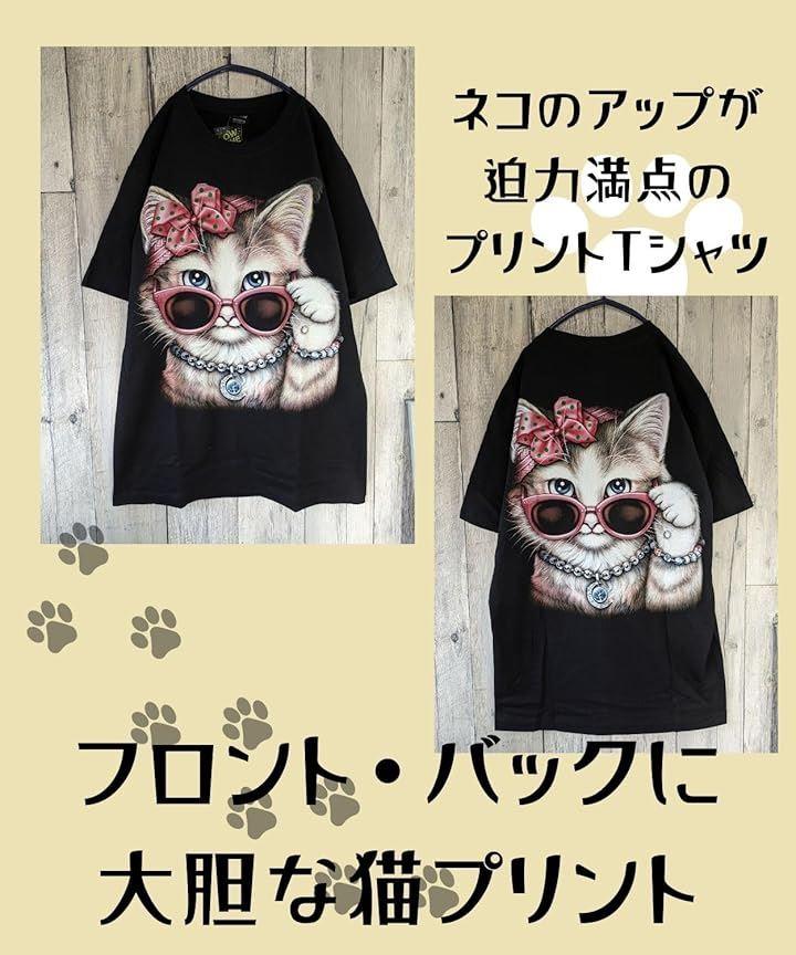 フロント・バックプリントの大きなリボンとサングラスをつけたネコが迫力満点のプリントTシャツです。