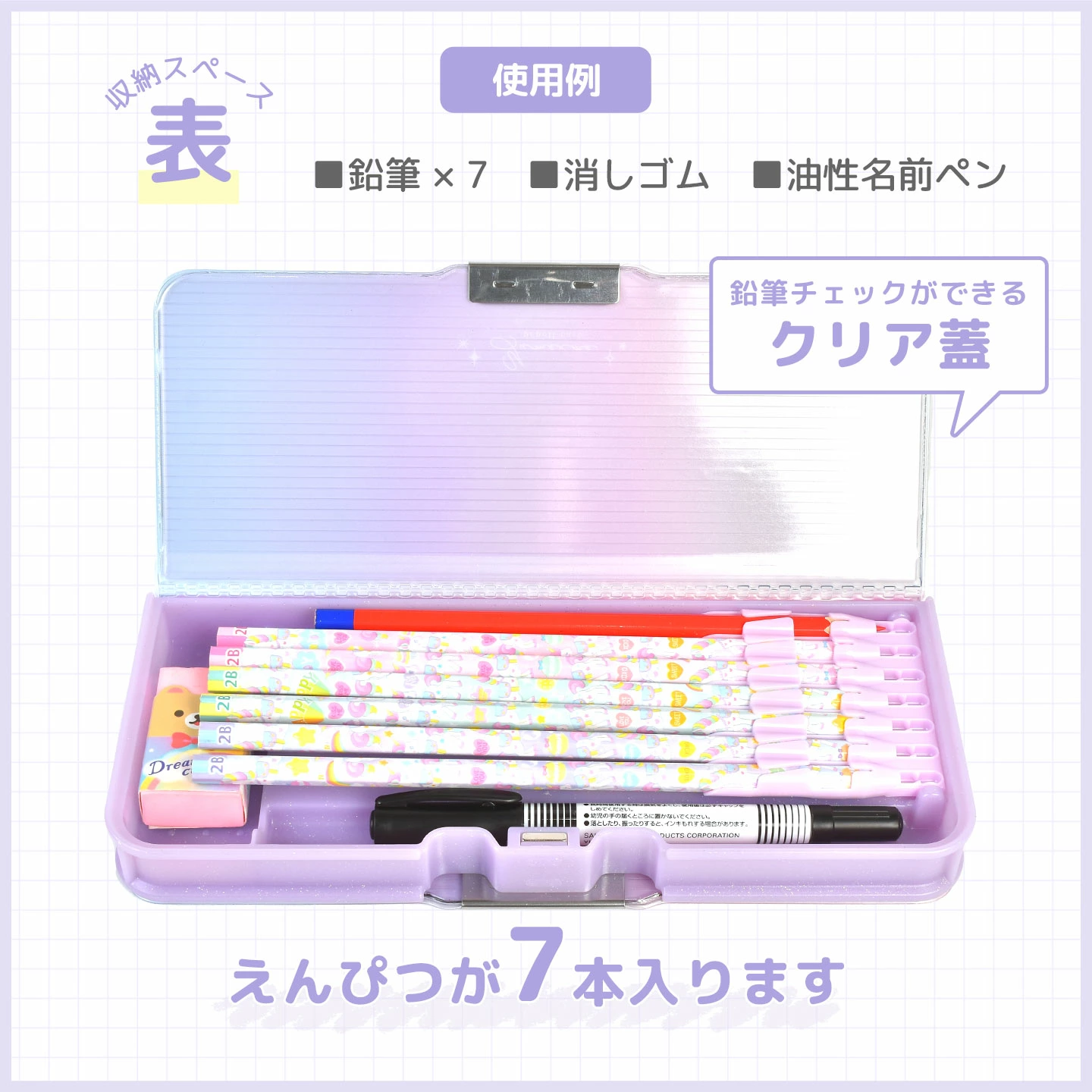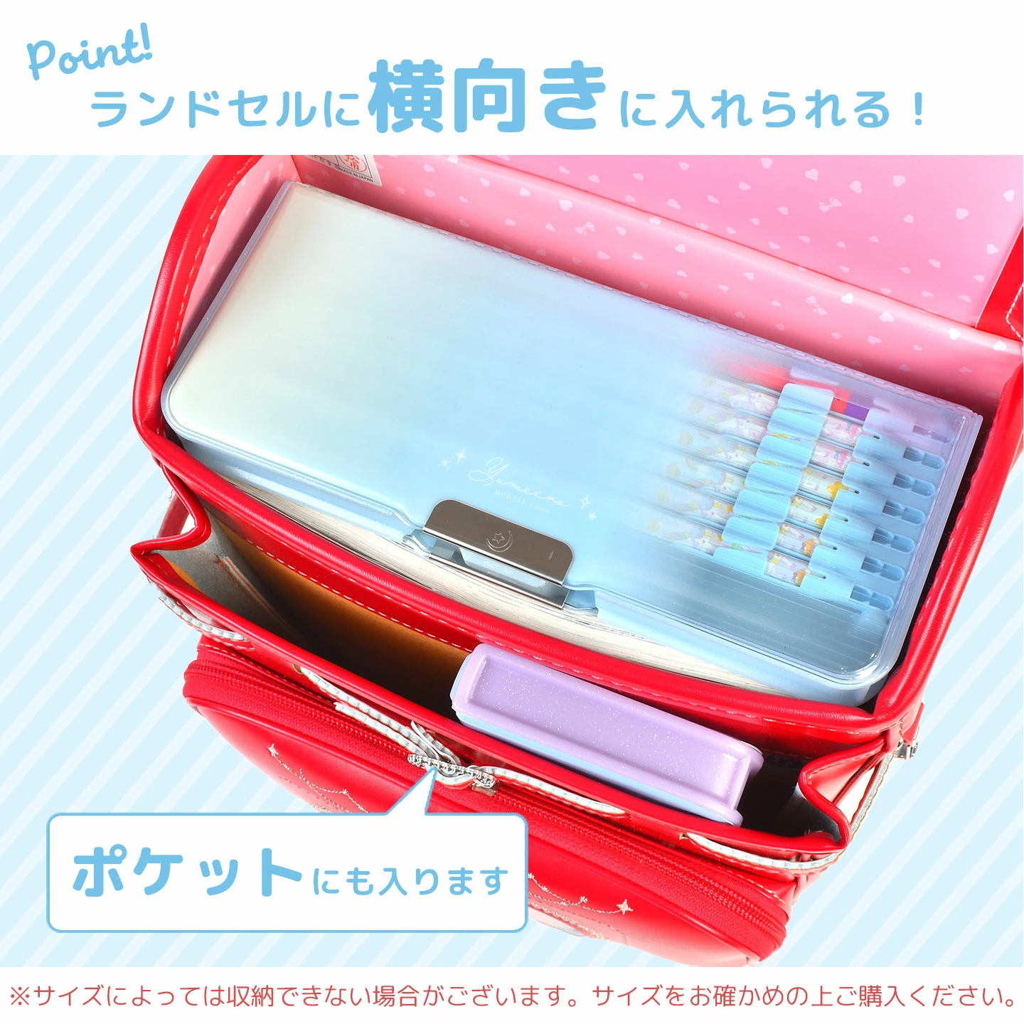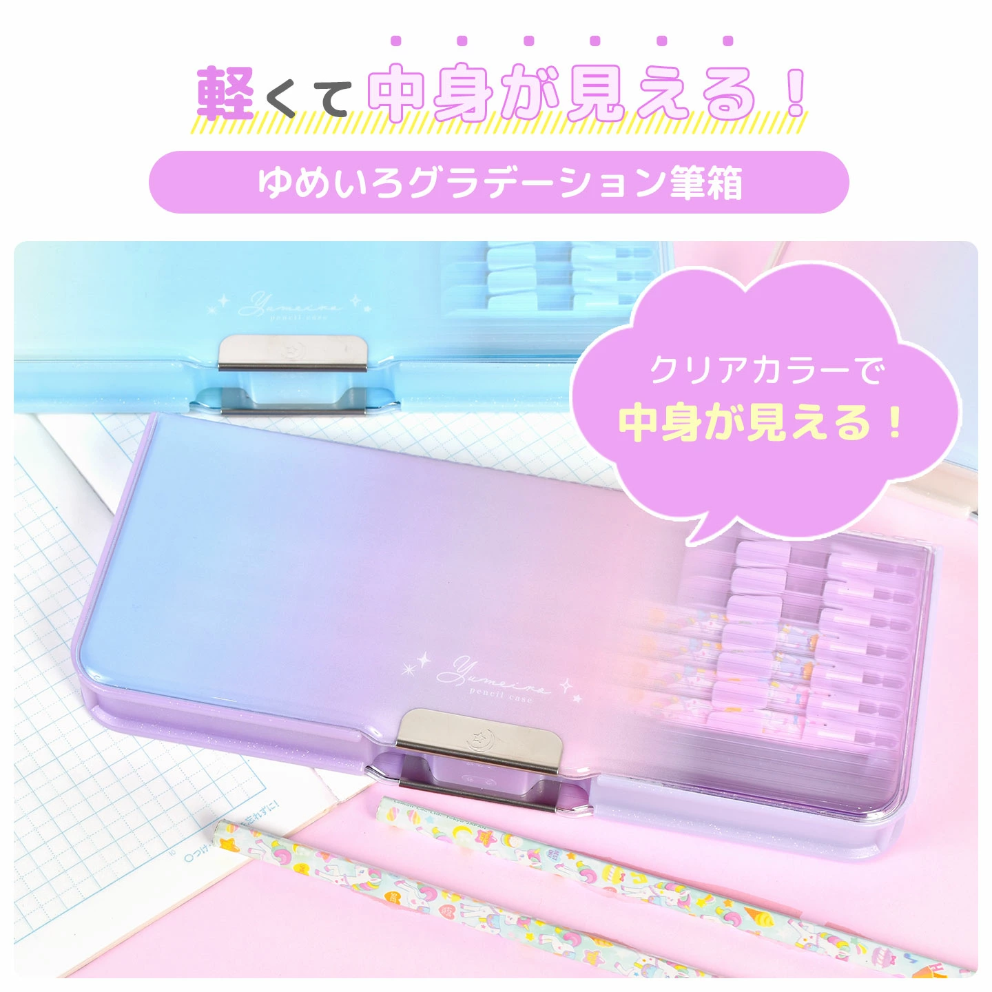 【ゆめいろグラデーション筆箱】グラデーションカラーがかわいい!女の子に大人気のクリア素材を使用した軽くておしゃれな筆箱が登場。フタの端がクリアカラーになっているので、一目でえんぴつの忘れ物チェックができて便利♪ランドセルの上やポケットに綺麗に収まるコンパクトサイズ。鉛筆7本とネームペン、消しゴム、定規など必要なものがしっかり入ります。時間割を書き込めるシール付き。プレゼント・ギフトにも◎