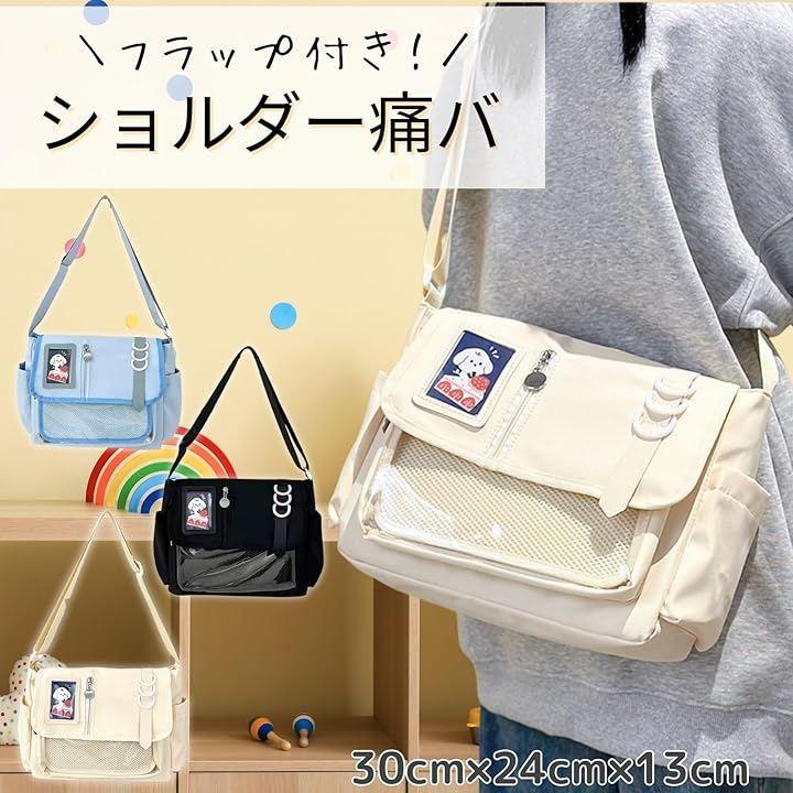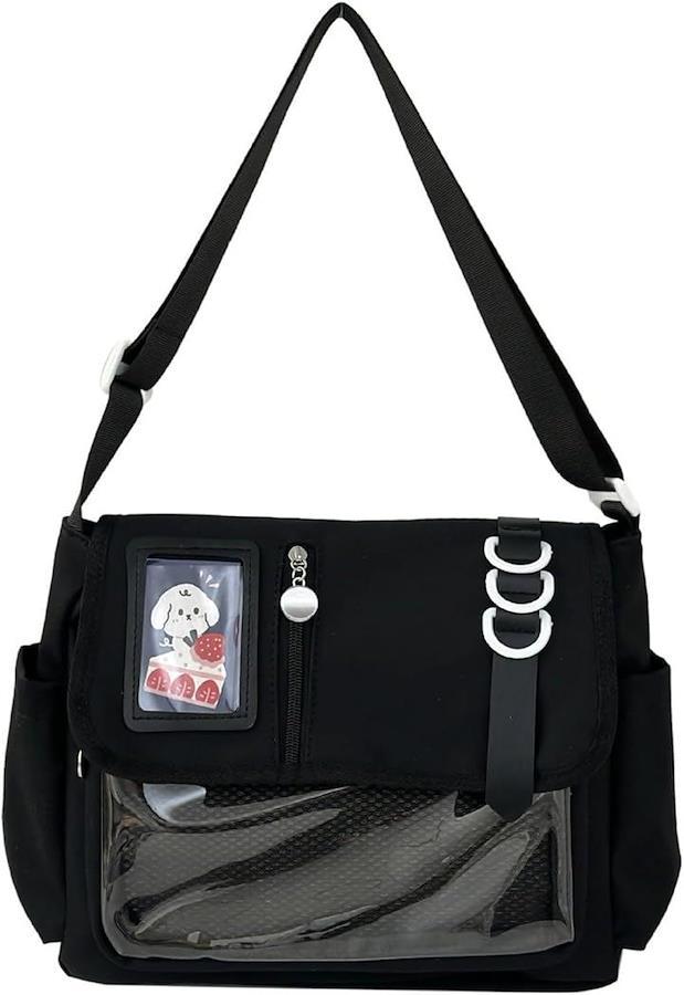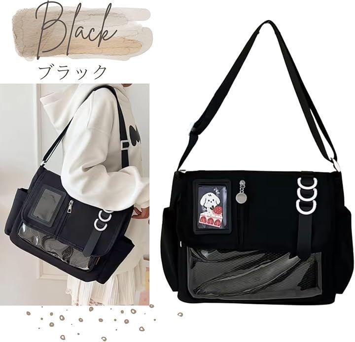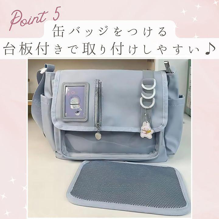 前面に大きなクリアポケットがあるので、缶バッジやアクスタ、写真など「推しグッズ」を飾って持ち歩ける痛バッグ。
