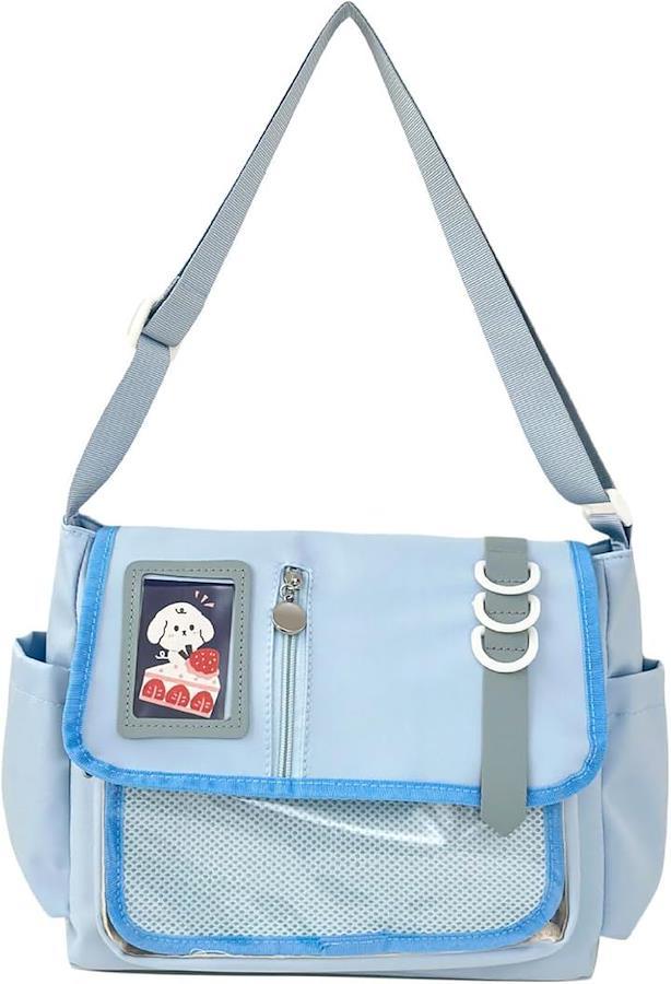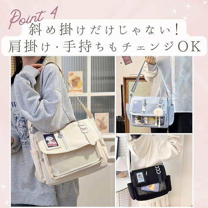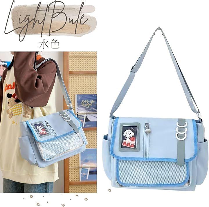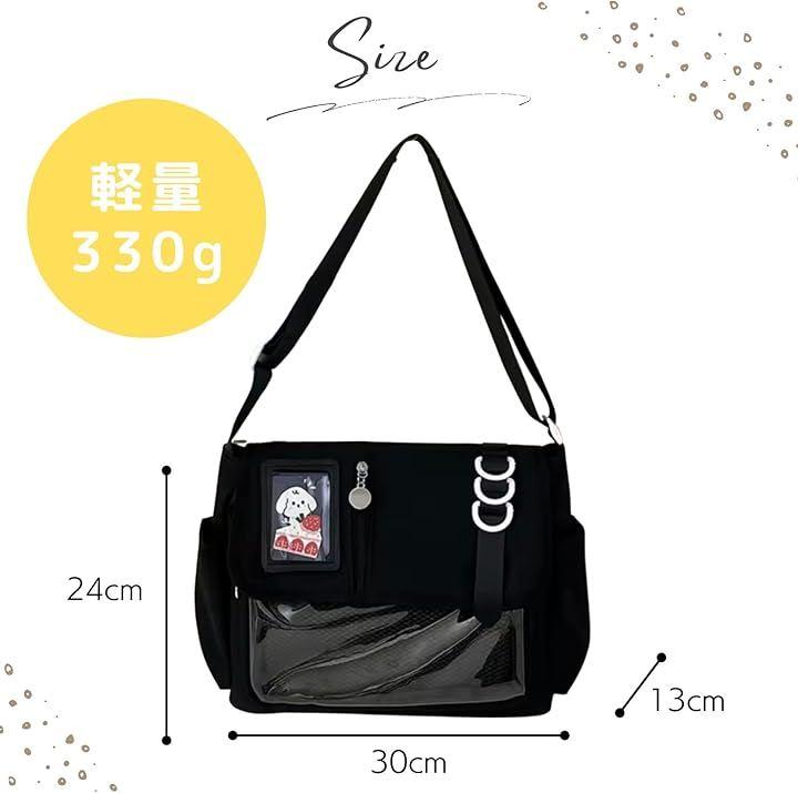 前面に大きなクリアポケットがあるので、缶バッジやアクスタ、写真など「推しグッズ」を飾って持ち歩ける痛バッグ。