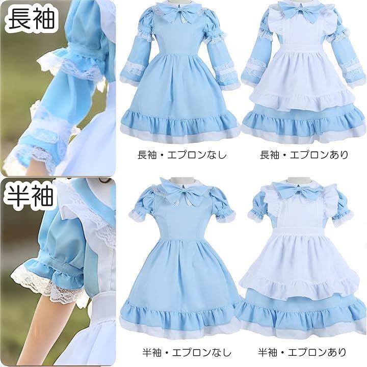 「セット内容」ワンピース+カチューシャ+リボン(安全ピン)+付け袖 「カラー」ブルー 「サイズ」S, M, L, XL, XXL *Sサイズ>身長90-100cm、バスト64cm、ウエスト58cm、裾丈60cm / *Mサイズ>身長100-120cm、バスト68cm、ウエスト58cm、裾丈63cm / *Lサイズ>身長120-130cm、バスト72cm、ウエスト65cm、裾丈66cm / *XLサイズ>身長130-140cm、バスト76cm、ウエスト69cm、裾丈70cm / *XXLサイズ>身長140-150cm、バスト82cm、ウエスト72cm、裾丈76cm *平置き採寸。