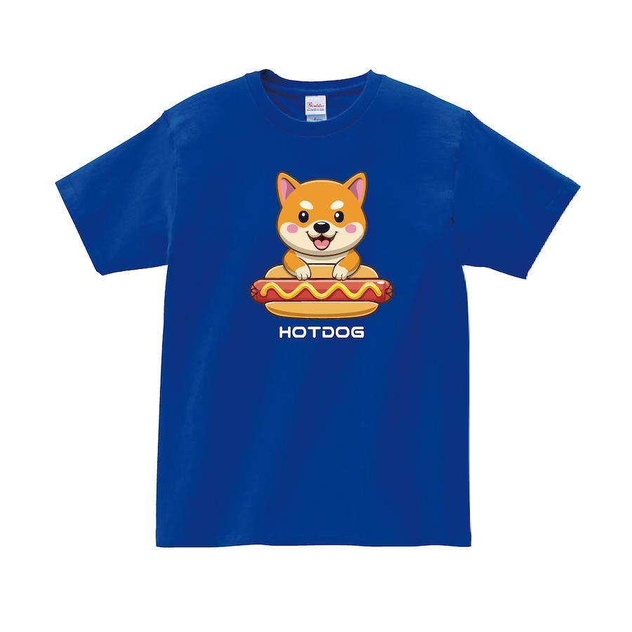ホットドッグを食べようとしているかわいい柴犬のTシャツです。※画像ははめ込み画像となり、実際とは多少異なりますので予めご了承ください。 ※サイズ表をよくご確認の上ご購入ください。 ※受注生産となるため、返品、交換はご遠慮ください。