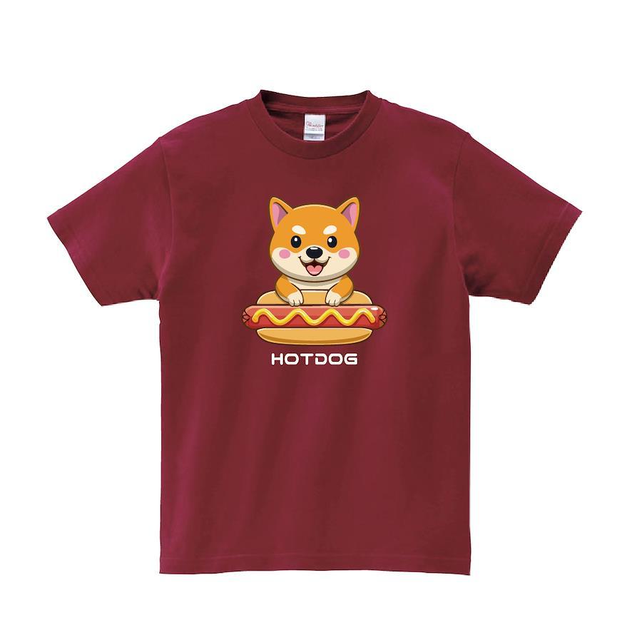 ホットドッグを食べようとしているかわいい柴犬のTシャツです。※画像ははめ込み画像となり、実際とは多少異なりますので予めご了承ください。 ※サイズ表をよくご確認の上ご購入ください。 ※受注生産となるため、返品、交換はご遠慮ください。