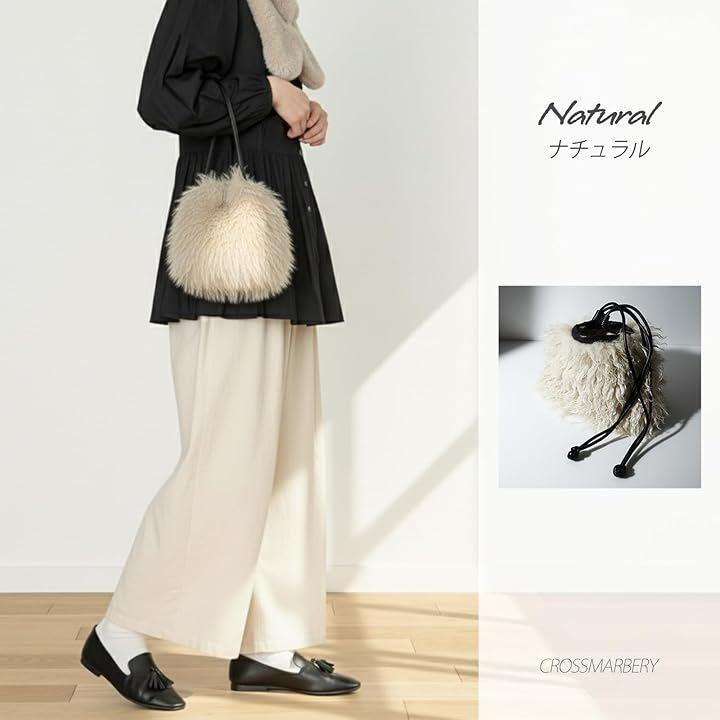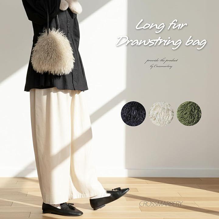 Cute, small, crossbody drawstring bag for women, white, round bottom, faux leather, lightweight, faux fur, stylish, elegant, perfect for commuting, going out, or everyday use.