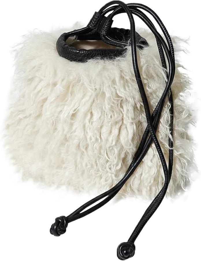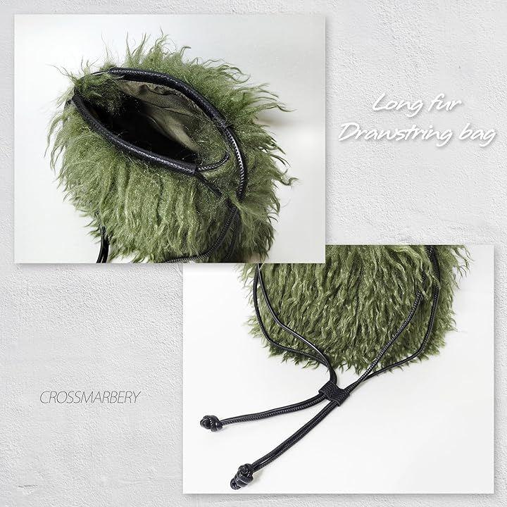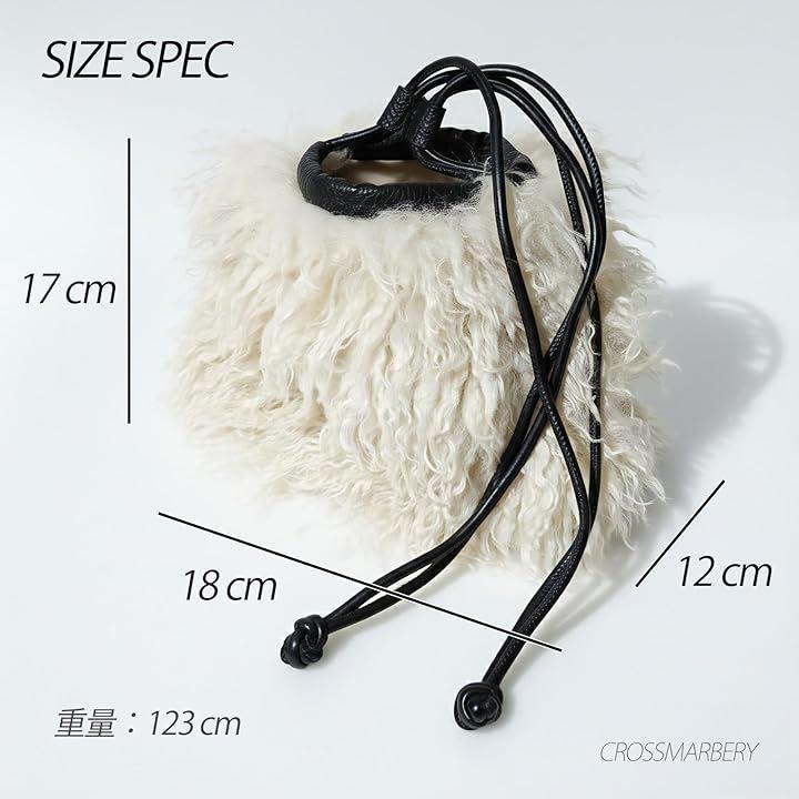 Cute, small, crossbody drawstring bag for women, white, round bottom, faux leather, lightweight, faux fur, stylish, elegant, perfect for commuting, going out, or everyday use.