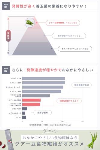 1. 医療現場で選ばれてきた高品質な食物繊維 「グアー豆食物繊維」を配合 高発酵性だから善玉菌の栄養になりやすく、発酵速度が穏やかだからおなかにもやさしい。全国5000か所以上の病院・高齢者施設で採用されてきた高品質な食物繊維。 2. 持ち運びに便利なスティックゼリーで、どこでもインナーケア。 コスメポーチに入るサイズだから、ご自宅でもオフィスでも、あるいはカラダの調子が変化しやすい旅行先でも。どこでも手軽にインナーケアを。 3. 1本あたり18kcal。でも、毎日つづけたくなるおいしさ。 4. つるんとした食感のゼリーに、ほどよい甘さのライチ味。 心地よい一日のはじまりに。仕事中の息抜きや小腹がすいたときにも。