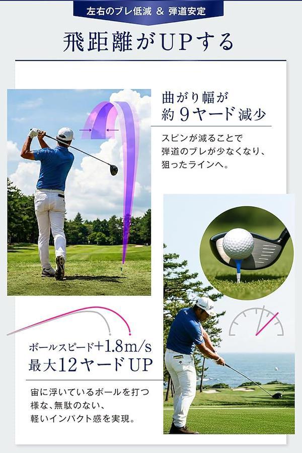 「飛距離最大12ヤードUP・曲がり幅を抑制」 抵抗が少ないためボール初速が最大1.8m/s向上し、飛距離が伸びます(最大12ヤードUP)。