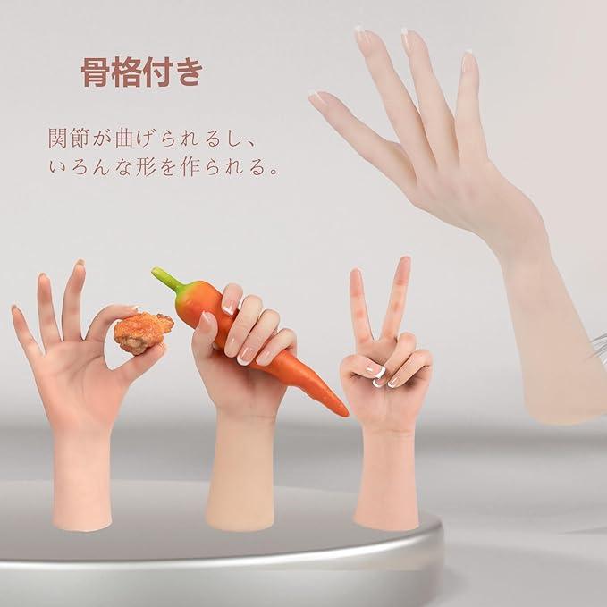 ■商品説明【骨感手】骨っぽい指がほっそり、骨格と青筋がはっきり、痩せってる女性がモデルにして、骨感の美感を表現される。 【リアル】肌のテクスチャと骨格構造は本物と驚くほど似ている。静脈、毛細血管、指紋まで再現、手触り、見た目、色合いや細部など、お見事に表現しております。 【触り心地】本製品は無毒、無臭な高級シリコン素材を採用される、人体の触り心地に最も近い材質なので、他の材質より、さらにリアルです。 【骨格付き】はっきりな骨格構造があるので、立つことができるし、手首、指が自由に造形できます。 【用途とサイズ】爪の形は自由にカットできるし、色々なネイルを好きにDIYや練習できます。撮影用・絵画モデル・デッサン用・時計、ジュエリー、ブレスレット等のディスプレイ用、ハロウィンの道具等、多用途でお使いいただけます。サイズは全長:約27cm、手長約19cm、手首周り:約15cm、重量: 約0.5kg/片手