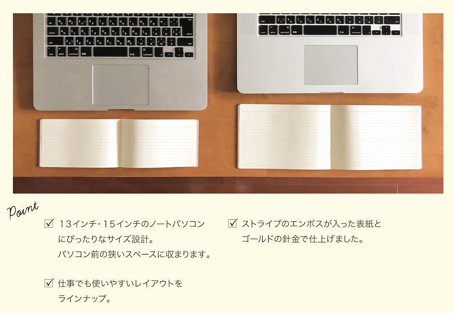 リモートワークやオンライン会議など、パソコンを前にして仕事や勉強の際に、メモしたい、ノートをとりたいと思う時に、家でなかなかスペースが確保できません。パソコンの前の狭いスペースに着目した、横型タイプのノートです。通常のノートは広げるとパソコンの前のスペースでは置けないし、キーボードの上は書きにくいし、横にはスペースがない・・・そんな時に最適な商品です。