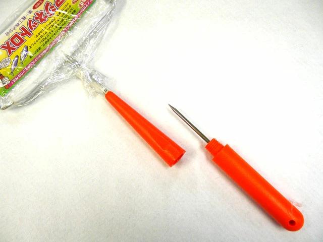海水をタップリ含んだ厚手不織布製ネットの中で、活きアジをつかんで仕掛けをセットして下さい。手で直接つかむと、アジはヤケドしてウロコが落ち元気がなくなります。しかもアイスピック内臓!アオリイカを簡単一発でしめられる!