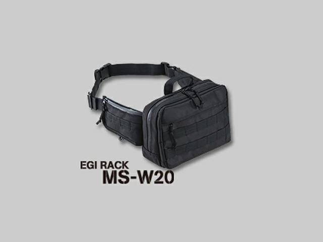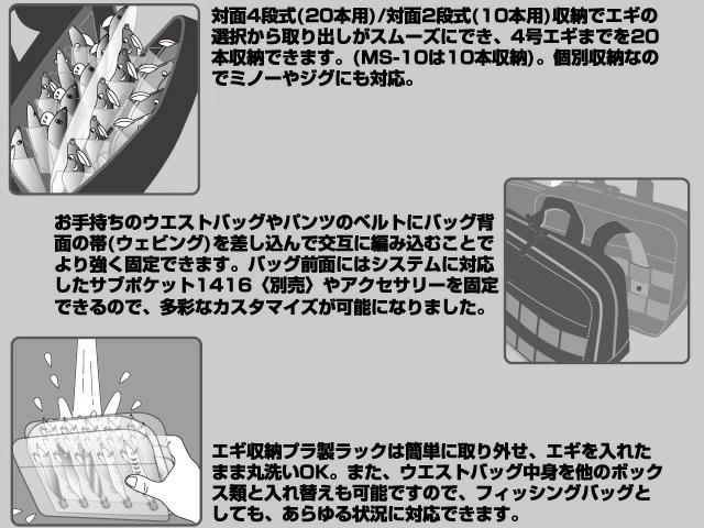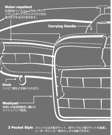 フロントに大型ポケット、両サイドに小型ポケットを装備し、リーダーやシンカー等をたっぷり収納でき、背面には吸湿発散性に優れたメッシュパッドを採用。コンビニ袋などを掛けられるフックやハンドキャリーも装備。