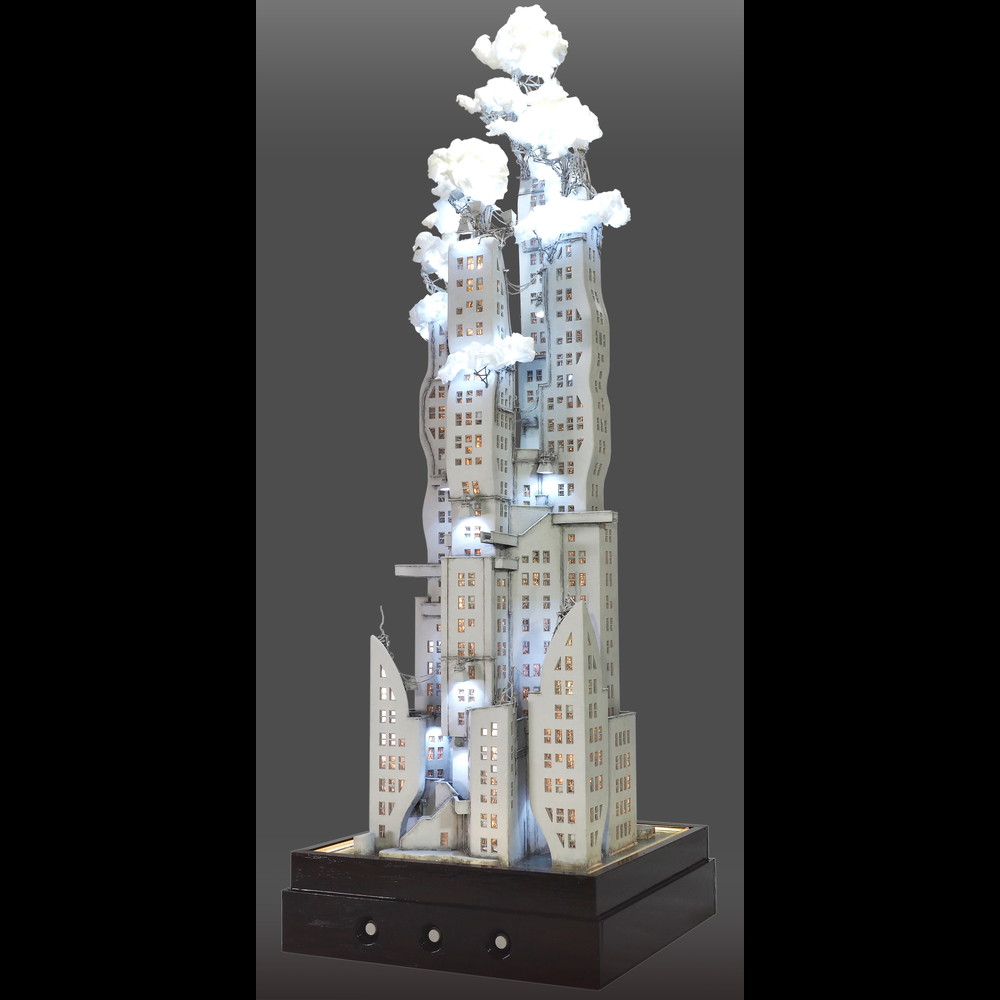 主な使用材料: アクリルケース(防塵用・押出し透明5mm)、ボール紙、イラストボード、透明アクリル板(窓部分・0.2mm厚)、木材(台座部分=シナベニア、ラワンベニア、アガチス単板)、艶消しアクリル絵具(ホルベイン・アクリラガッシュ)、ターナー「MILK PAINT・スノーホワイト」、