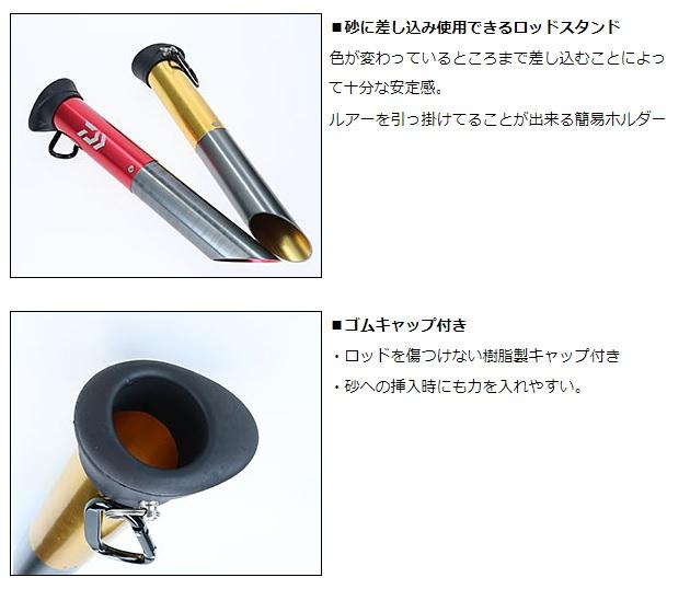 砂浜に差し込み固定できるロッドスタンド。対応ロッド径33mmまで。11Ftまでの使用を想定したロング設計。竿のバッドを傷つけにくいゴムキャップ付き。携帯に便利なカラビナ付き 全長:300m 重量:160g ※実物と色が違って見える場合があります。あらかじめご了承下さい。