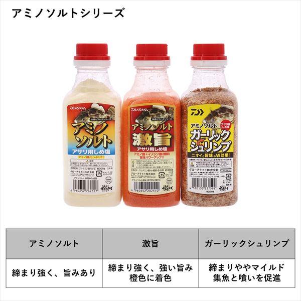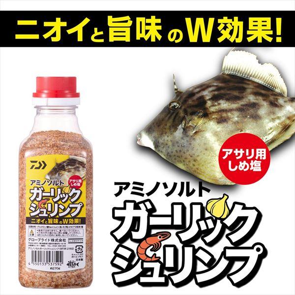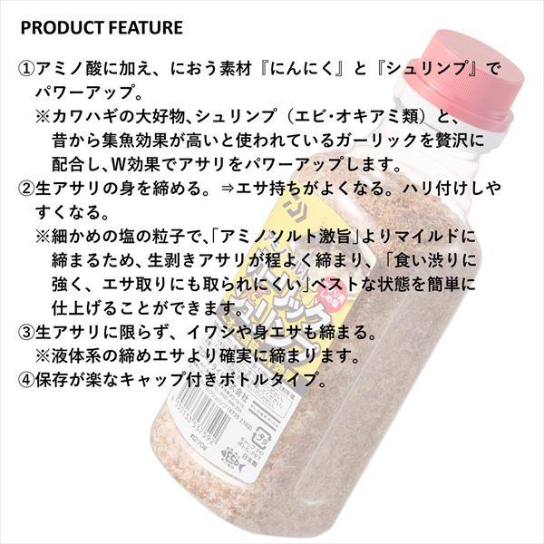 アミノ酸に加え、ガーリックとシュリンプを配合。ニオイと旨味のW効果でパワーアップ!アミノソルトシリーズに追加。●アミノ酸に加え、におう素材「にんにく」と「シュリンプ」でパワーアップ!※カワハギの大好物、シュリンプ(エビ・オキアミ類)と、昔から集魚効果が高いと使われているガーリックを贅沢に配合し、W効果でアサリをパワーアップします!●生アサリの身を締める。→エサ持ちがよくなる。ハリ付けしやすくなる。※細かめの塩の粒子で、「アミノソルト激旨」よりマイルドに締まるため、 生剥きアサリが程よく締まり、「食い渋りに強く、エサ取りにも取られにくい」ベストな状態を簡単に仕上げることができます。●生アサリに限らず、イワシや身エサも締まる。※液体系の締めエサより確実に締まります。●保存が楽なキャップ付きボトルタイプ。 内容量:約270g 主原材料:グルタミン酸Na・にんにく粉・えび粉・オキアミ粉末・塩 ※実物と色が違って見える場合があります。あらかじめご了承下さい。