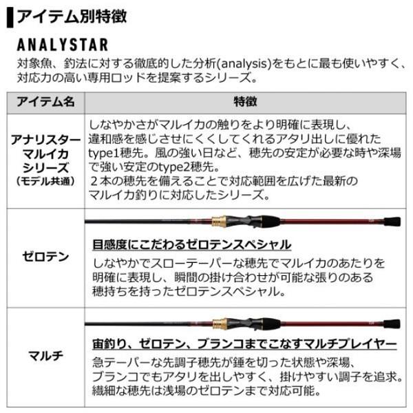 自重:78g 全長:1.6m 継数:2 仕舞寸法:111cm 先径/元径:0.7/10.9mm 錘負荷:10-50/20-60号 カーボン含有率:74% TYPE-2先径:0.7mm 【20ndamzm】【20newdaiwa】【ダイワ キャスティング情報2020秋】 2本の穂先でマルイカ攻略、高感度グラスソリッド。マルイカに違和感を感じさせにくく、触りをより明確に表現してくれるアタリ出しに優れたよりしなやかなtype1穂先。風の強い日など、穂先の安定が必要な時や深場で強い安定のtype2穂先。2本の穂先を備えることで対応範囲を広げた最新のマルイカ釣りに対応したシリーズ。■ゼロテン・・・目感度にこだわるゼロテンスペシャル。しなやかでスローテーパーな穂先でマルイカのあたりを明確に表現し、瞬間の掛け合わせが可能な張りのある穂持ちを持ったゼロテンスペシャル。※掲載している商品の画像は代表画像を表示しています。また実物と色が違って見える場合があります。あらかじめご了承下さい。