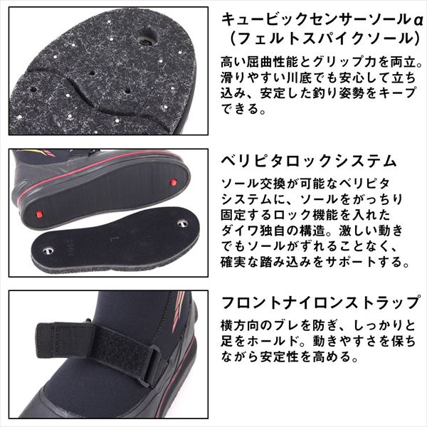 安定した立ち込みと快適性で、攻めの釣りを支える実釣性能を凝縮した鮎専用タビ。鮎釣りに求められる屈曲性・グリップ力・快適性を徹底追求したダイワのスペシャルタビ。キュービックセンサーソールαとベリピタロックシステムにより、高い安定性とフィット感を実現。さらに水抜け構造やフィット感を高める素材を採用し、日本製ならではの確かな品質で、長時間の釣行を足元から支える。 サイズ:L(25.5-26.0) カラー:ブラック タイプ:先丸中割 ソールタイプ:フェルトスパイク 防水仕様:非防水 素材:5mm厚クロロプレン ※実物と色が違って見える場合があります。あらかじめご了承下さい。