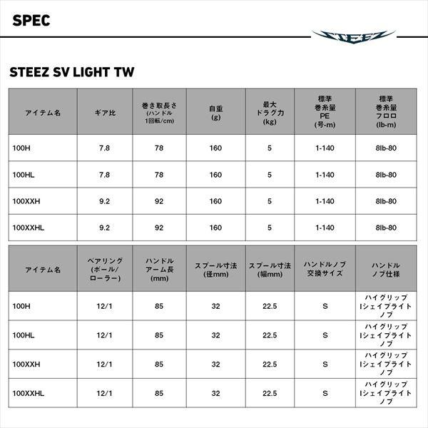 スプールの高レスポンス化により、さらなる低弾道キャストと、キャストアキュラシーの向上を実現した26STEEZ SV LIGHT TW。ギア比は7.8とシリーズ最速となる9.2をラインナップ。ギア比7.8は撃ちと巻きの双方の釣りスタイルに対応したオールラウンダー。ギア比9.2は、ハンドル一回転あたり92cmという巻き取り量を確保し、手返しの良さだけでなく、糸ふけの素早い回収やカバーから魚を引きはがす際にも威力を発揮する。ラインガイドにはテーパーTWSを採用し、SV BOOSTとの相乗効果でキャスト後半の伸びをサポートする。複雑で高精度なキャストが要求されるハイプレッシャーフィールドでこそ真価を発揮する、究極のライトバーサタイルモデルが完成した。 重量(g):160 巻取長さ/ハンドル1回転(cm):92 ギア比:9.2 巻糸量フロロ:8lb-40~80m、12lb-25~50m 巻糸量PE(号-m):1-140、1.5-100 ベアリング:12/1 ドラグ力(kg):最大5 ハンドルアーム長(mm):85 スプール径(mm):32 スプール幅(mm):22.5 ハンドルノブ仕様:ハイグリップIシェイプライトノブ ハンドルノブ交換サイズ:S 使用環境:ソルト対応 ※実物と色が違って見える場合があります。あらかじめご了承下さい。