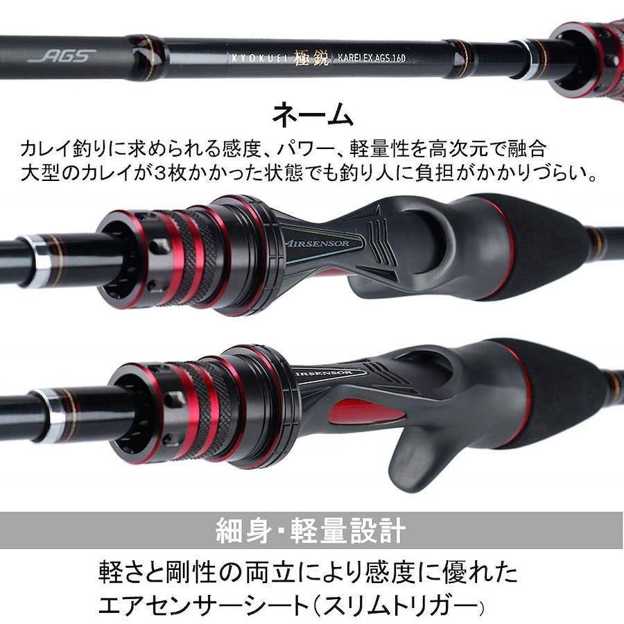 感度と小突きを究めるカレイ専用ロッド! 一日を通して錘を小突き続けるタフなカレイ釣り。さらにアタリを感じて、思いのままにカレイを掛ける繊細さが求められる。ロッドに必要な性能は感度と小突きやすさ、そして大型の多点掛けにも対応できるパワー。極鋭カレイEXはESSを採用し、それらカレイ釣りに求められる性能を高次元で融合することに成功した。カレイがどの針に付いたかを判断できることはもちろん、モタレや触りをいち早く感じることができる理想の感度を「SMT」が実現。ブランクスにはSVFナノプラスを採用し、小突きやすさと軽量性を追求した。さらにX45を搭載することで多点掛けにも余裕で対応できるパワーを実現。パーツにも徹底的にこだわり、ガイドには軽量・高剛性・トラブルレスのRタイプフレームと、薄肉・軽量のNリングを搭載した「AGS」、リールシートにはエアセンサーシート(スリムトリガー)を採用、更なる感度と操作性を実現する。