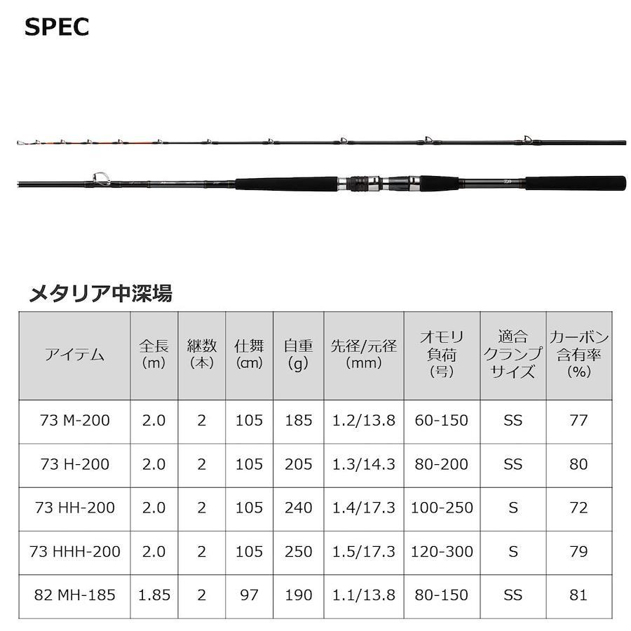 ターゲット:キンメ・オニカサゴ・赤ムツ・黒ムツ・オニカサゴ・メダイ・根魚全長(m): 2 / 継数: 2仕舞(cm): 105 / 自重(g): 250錘負荷(号): 120-300先径/元径(mm): 1.5/17.3